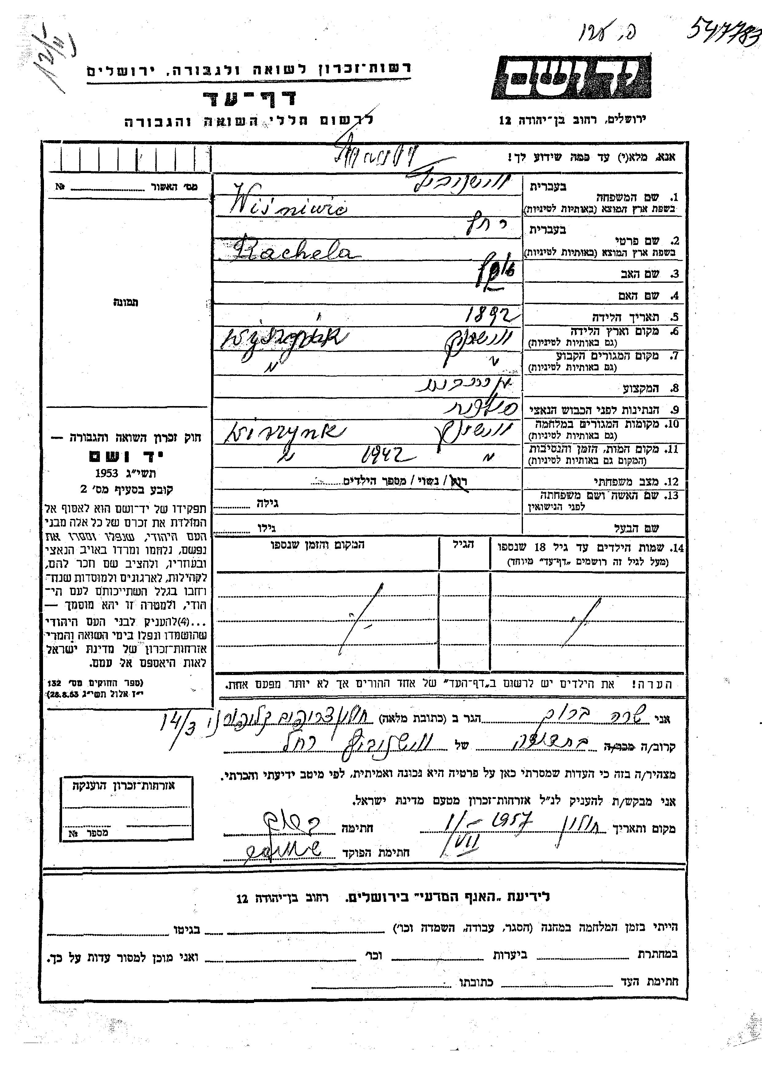 Яд Вашем - Листы свидетельских показаний Мемориального фонда
