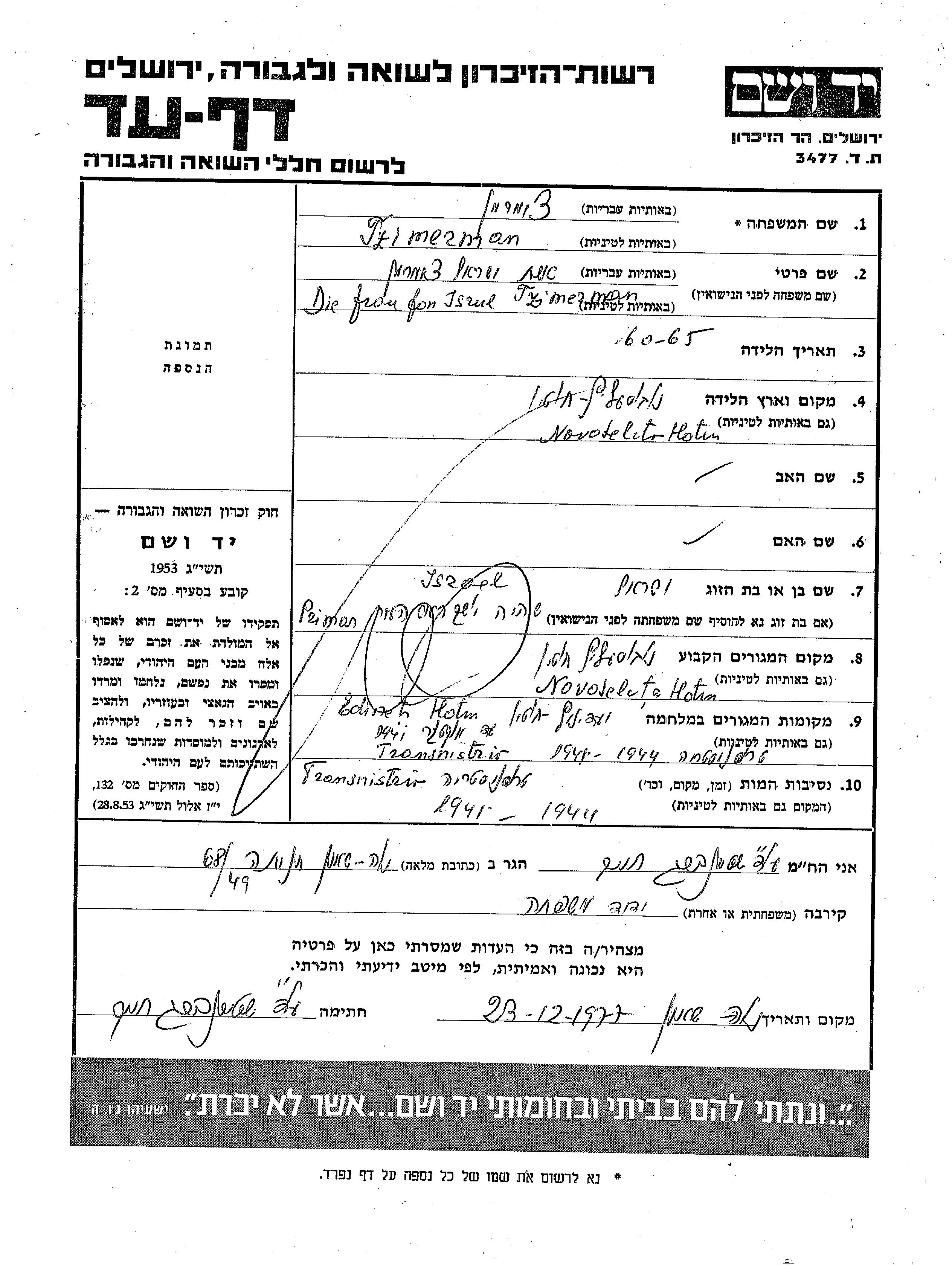 Цимерман Имя неизвестно Новоселица, Румыния Лист свидетельских показаний
