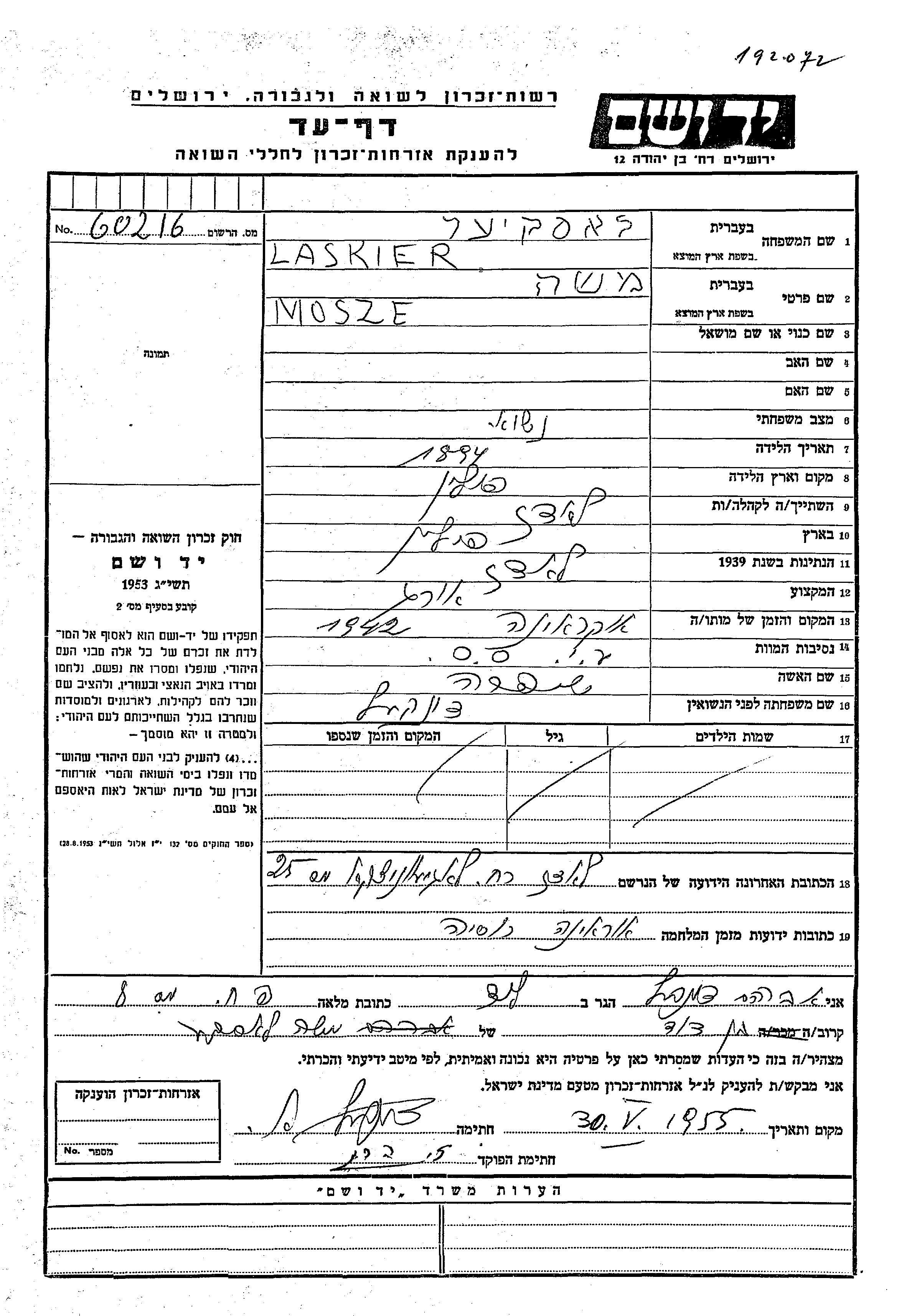 Ласкер Моше 1894 Лодзь, Польша Лист свидетельских показаний