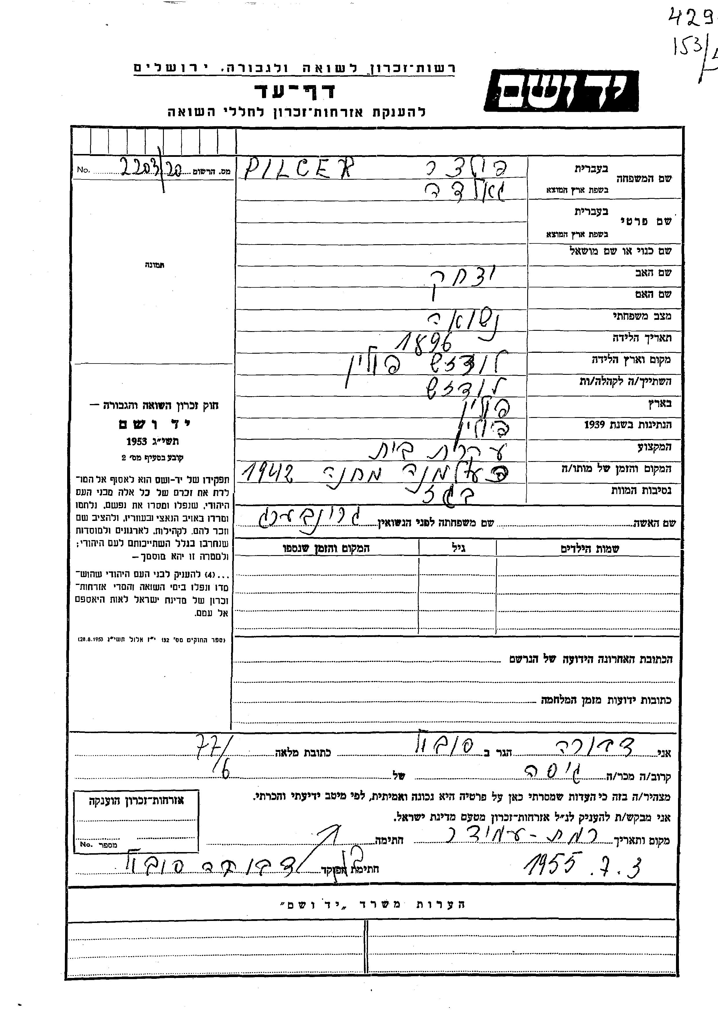 Имя неизвестно Пильцер, девичья фамилия Гринберг родился/родилась, место рождения: Лодзь, Польша. Отец: Ицхак. Домохозяйка. Женат / замужем.