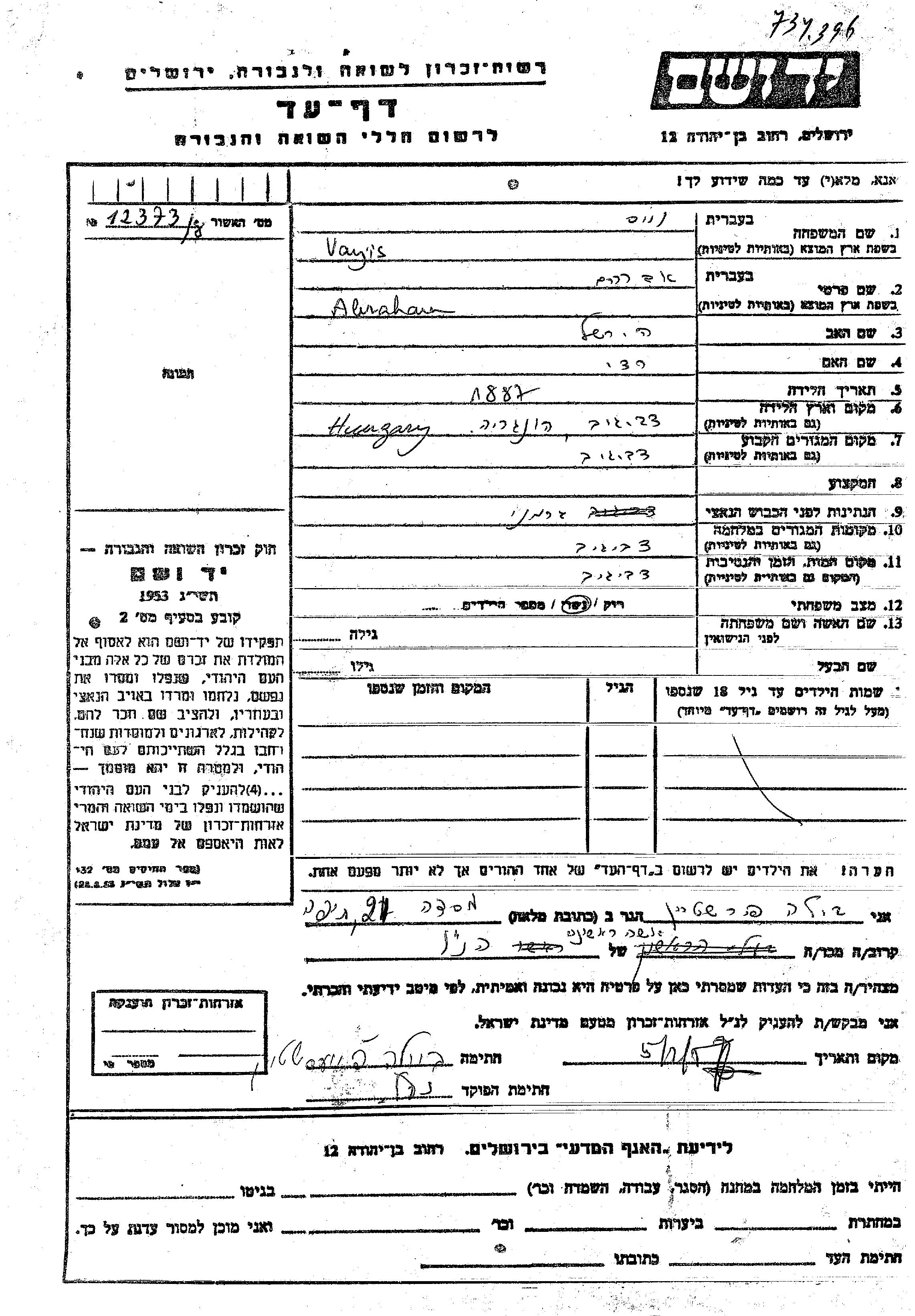 Вайис Абраам 1887 Завидово, Чехословакия Лист свидетельских показаний