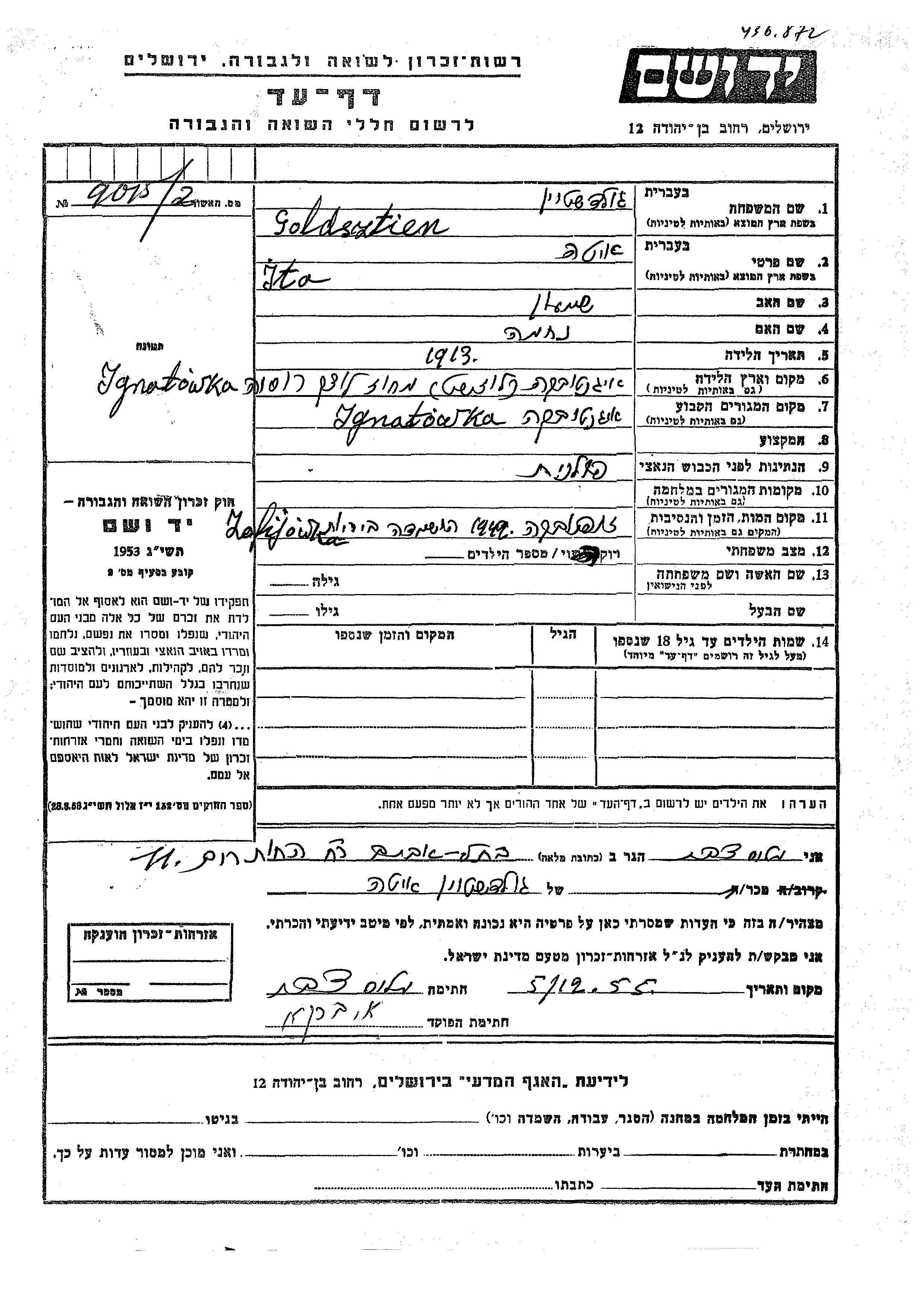 Ита Гольдштейн, место рождения: Игнатовка, Польша. Отец: Шимон, mать:Нехама. Холост / не замужем. Место жительства до войны: Игнатовка, Польша.