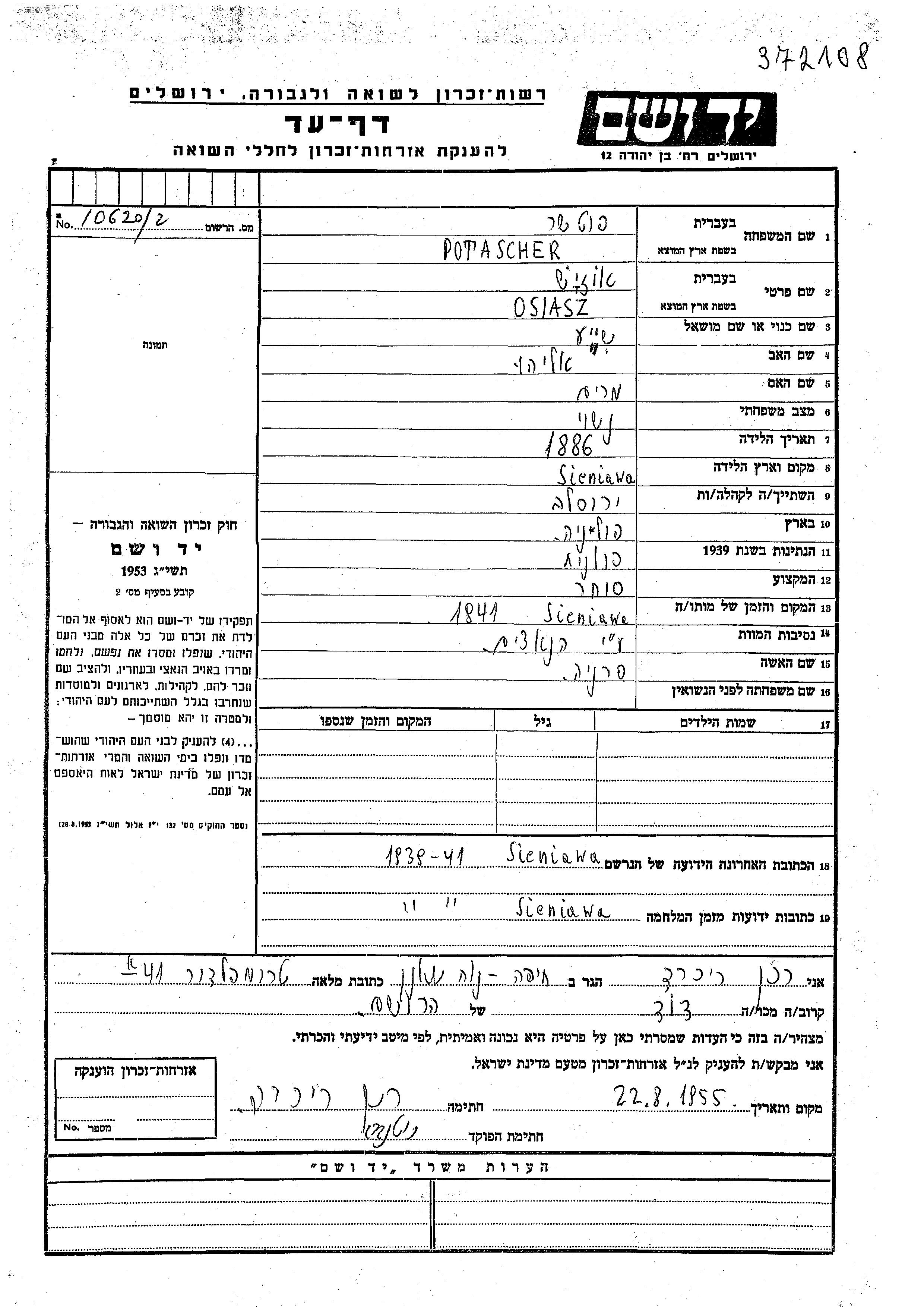 Осиаш Шие Поташер, место рождения: Сенява, Польша. Отец: Элиягу, mать:Мирьям. Торговец / торговка. Женат / замужем. Место жительства до войны: Ярослав, Польша. Место во время войны: Сенява, Польша.