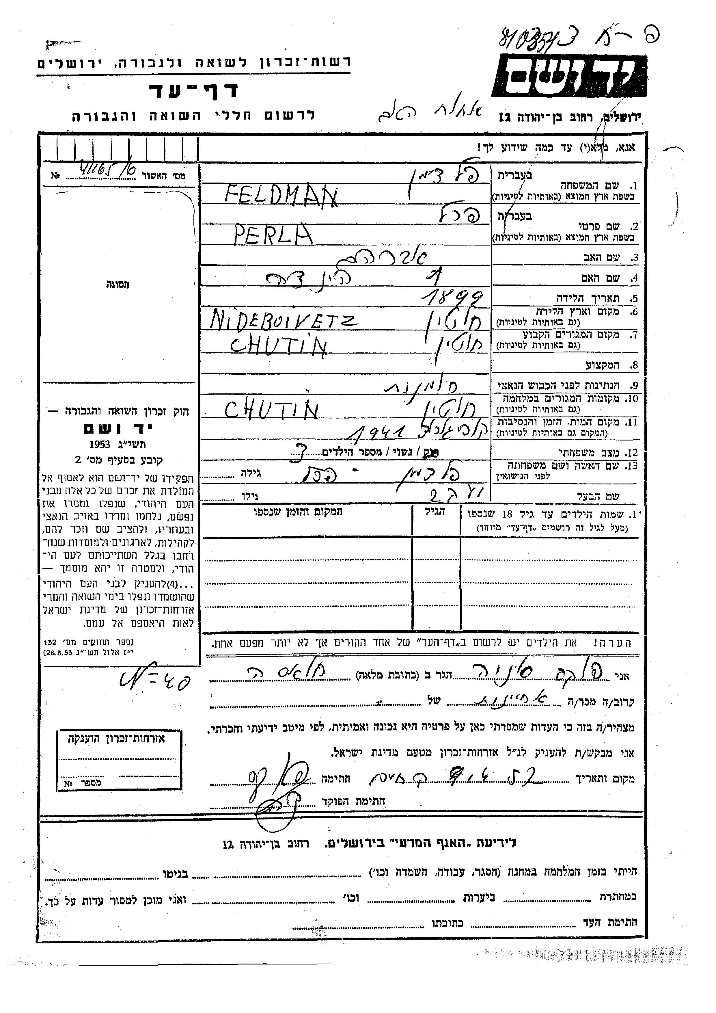 Перла Фельдман, место рождения: Хотин, Румыния. Отец: Авраам, mать:Хинда. Женат / замужем. Место жительства до войны: Хутин, Румыния. Место во время войны: Хутин, Румыния.