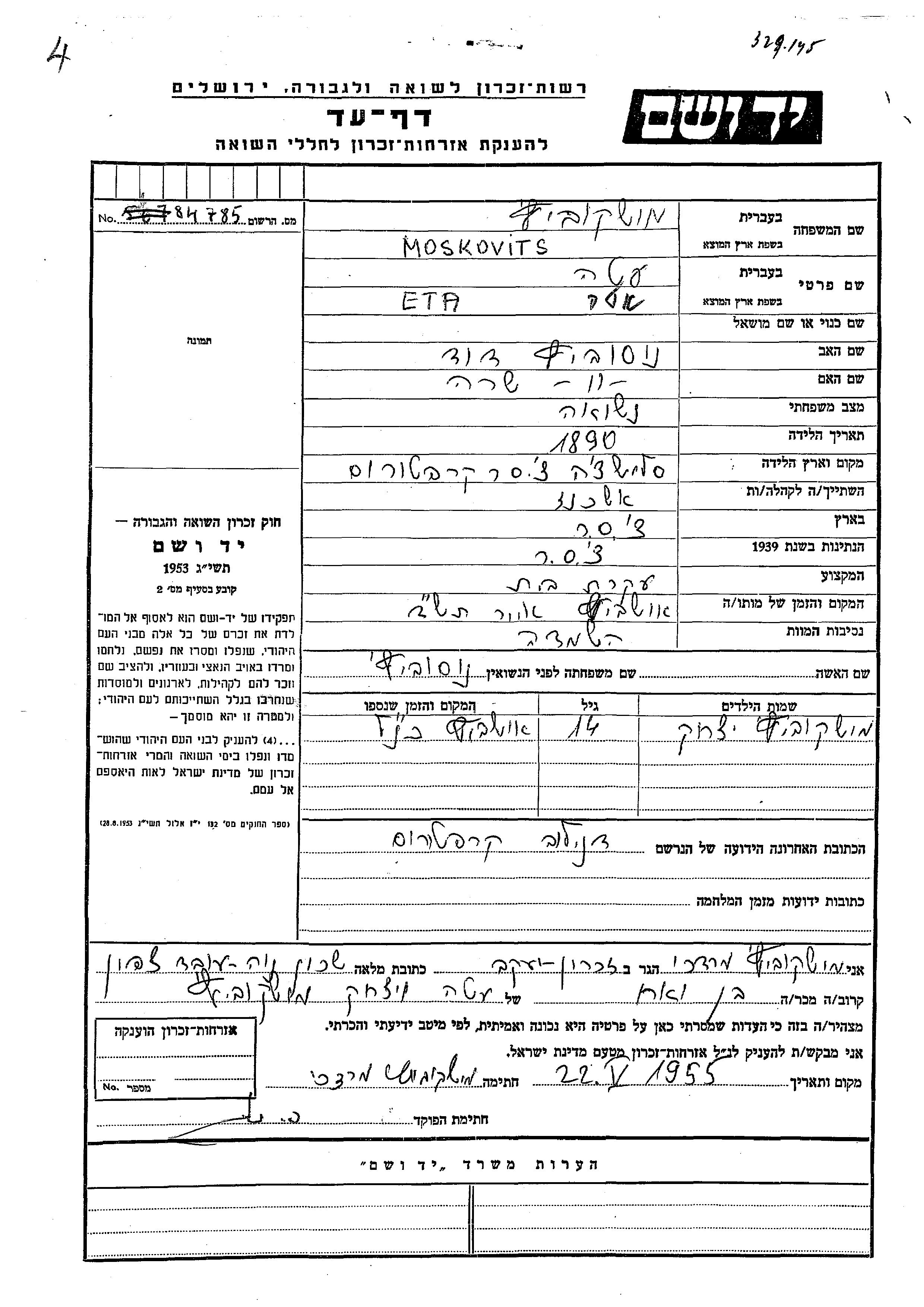 Эта Московиц, девичья фамилия Нусовиц, место рождения: Нижни Селиште, Чехословакия. Отец: Давид, mать:Сара. Домохозяйка. Женат / замужем. Место жительства до войны: Данилово, Чехословакия.