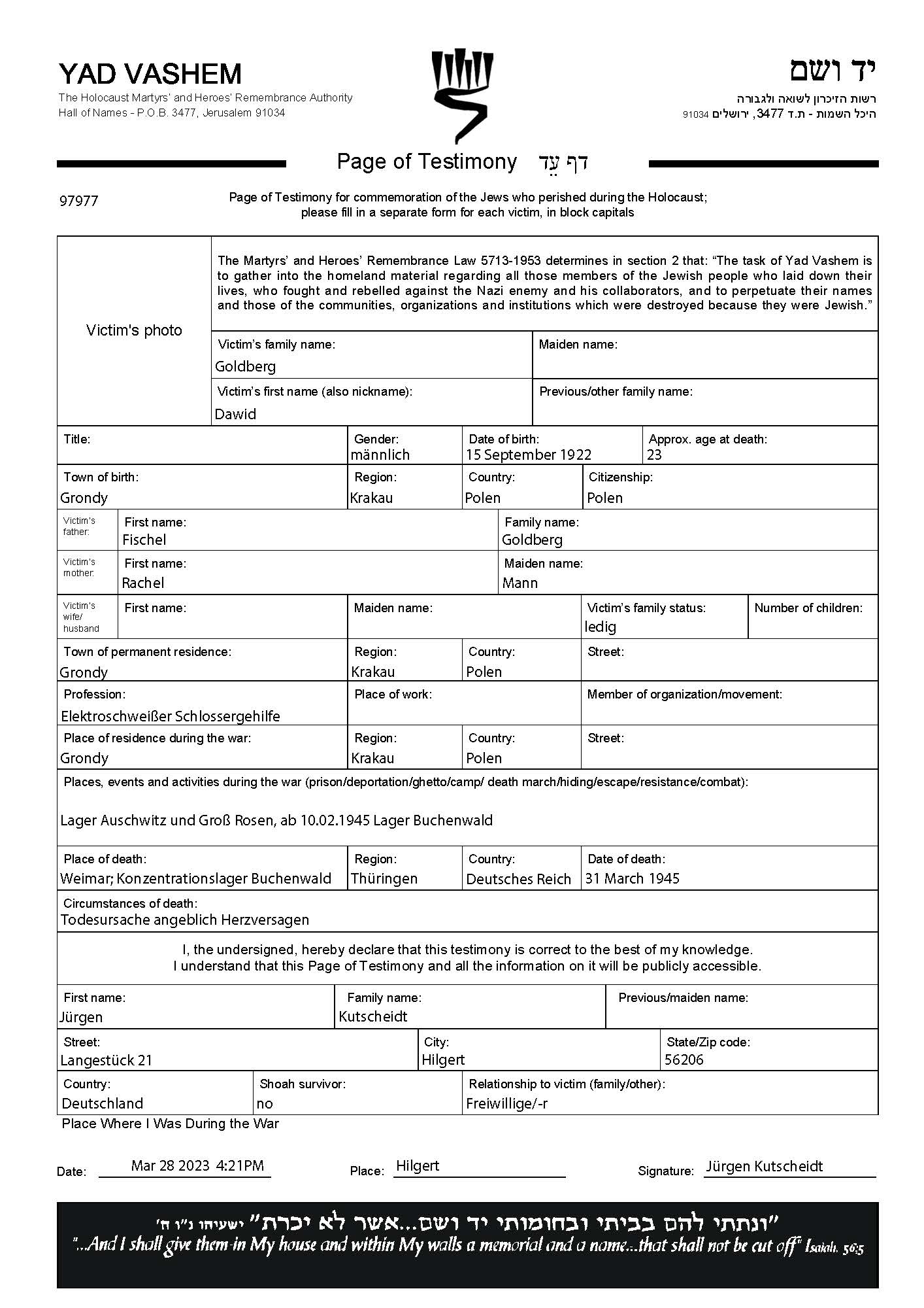 Гольдберг Давид 1922 Гронды, Польша Лист свидетельских показаний (электронный)