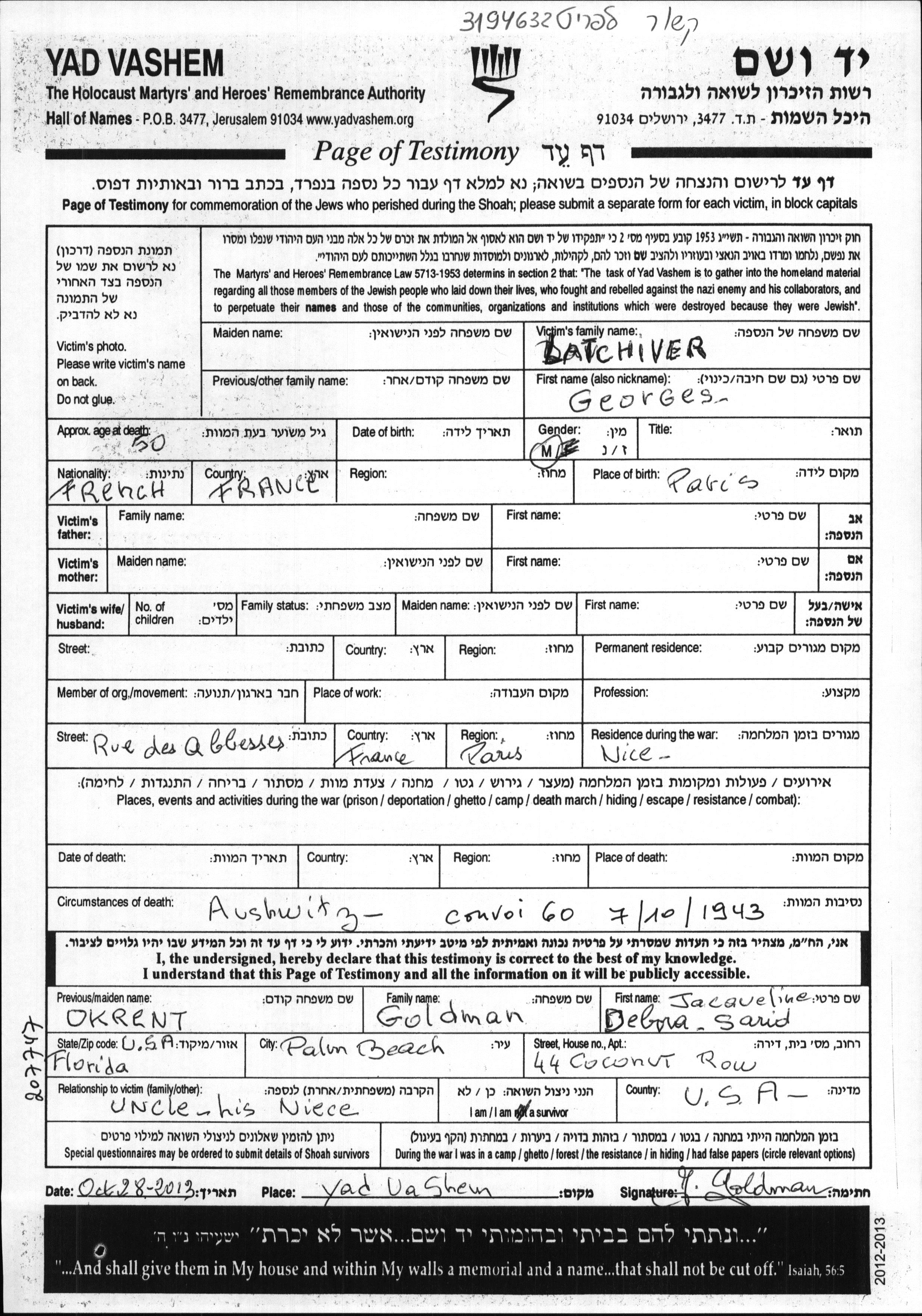 Жорж уничтожен в период Шоа. место смерти: Аушвиц, Польша в 07/10/1943.