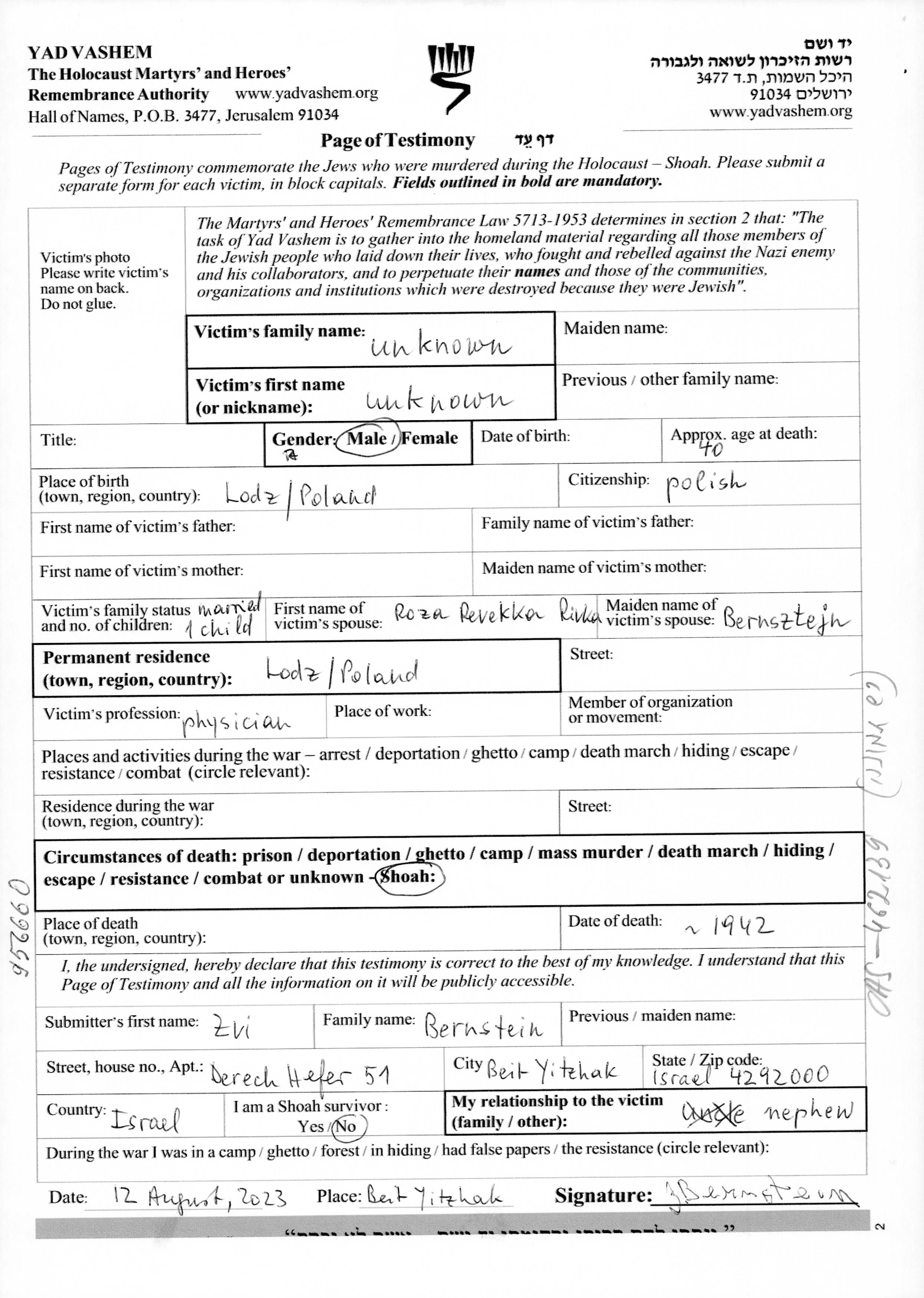 Фамилия неизвестна Имя неизвестно Лудзь, Польша Лист свидетельских показаний