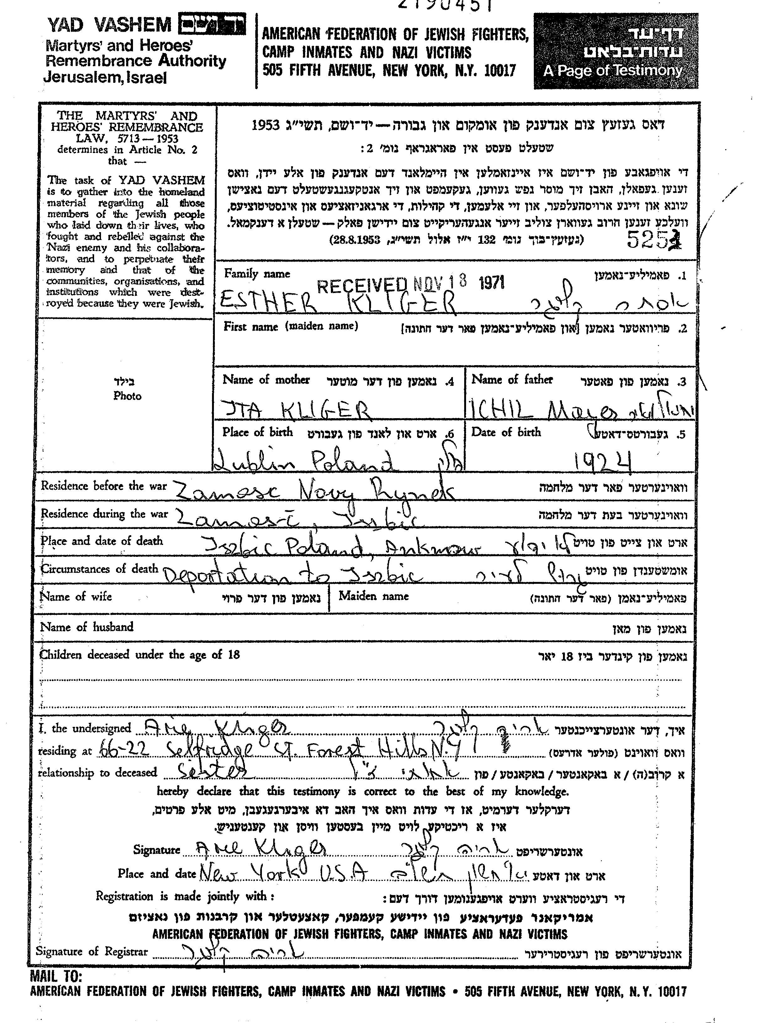 | Клигер | Эстер | 1924 | Замосць, Польша | Лист свидетельских показаний |