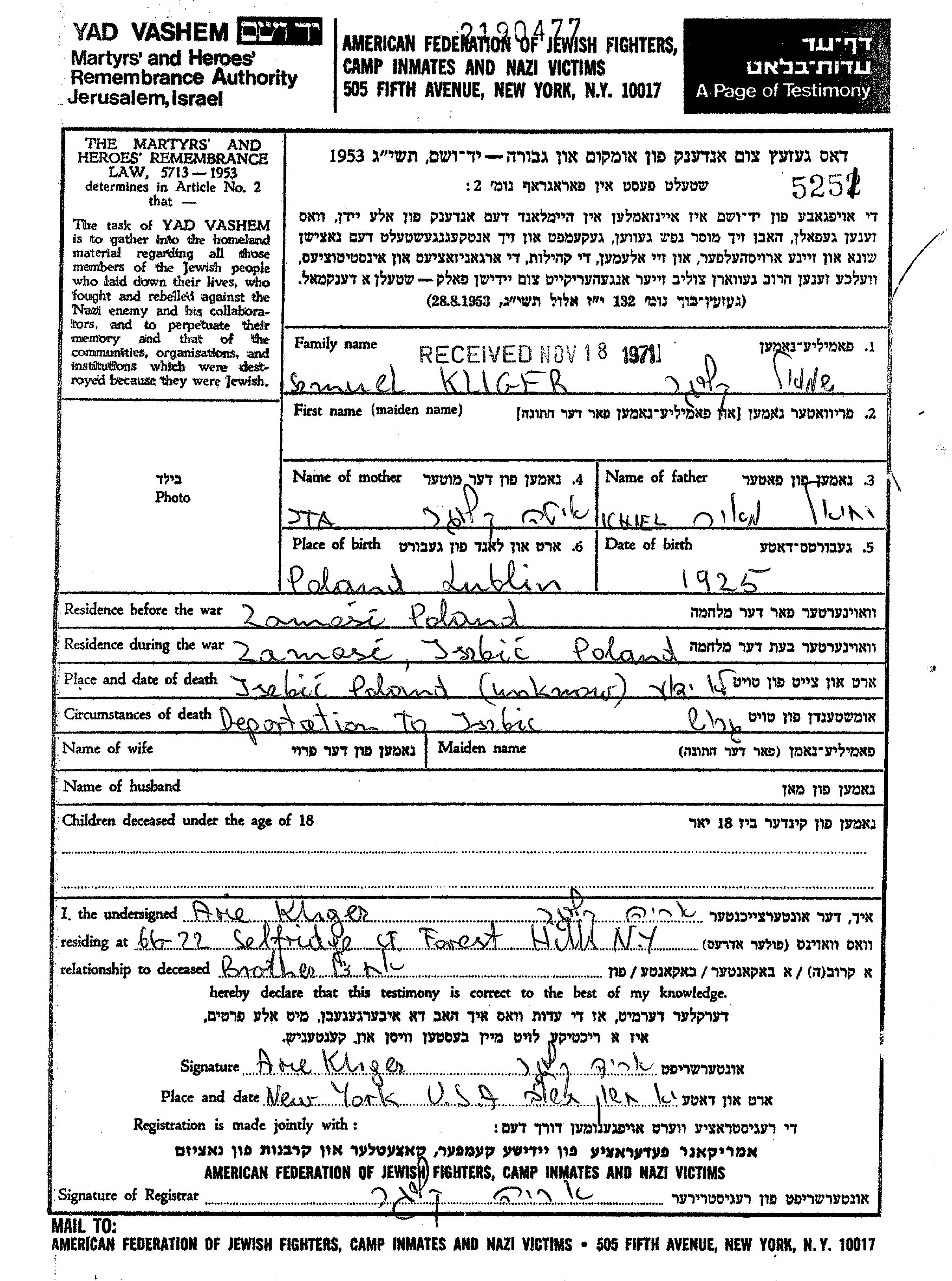 Самуэль Клигер, место рождения: Люблин, Польша. Место жительства до войны: Замосць, Польша.