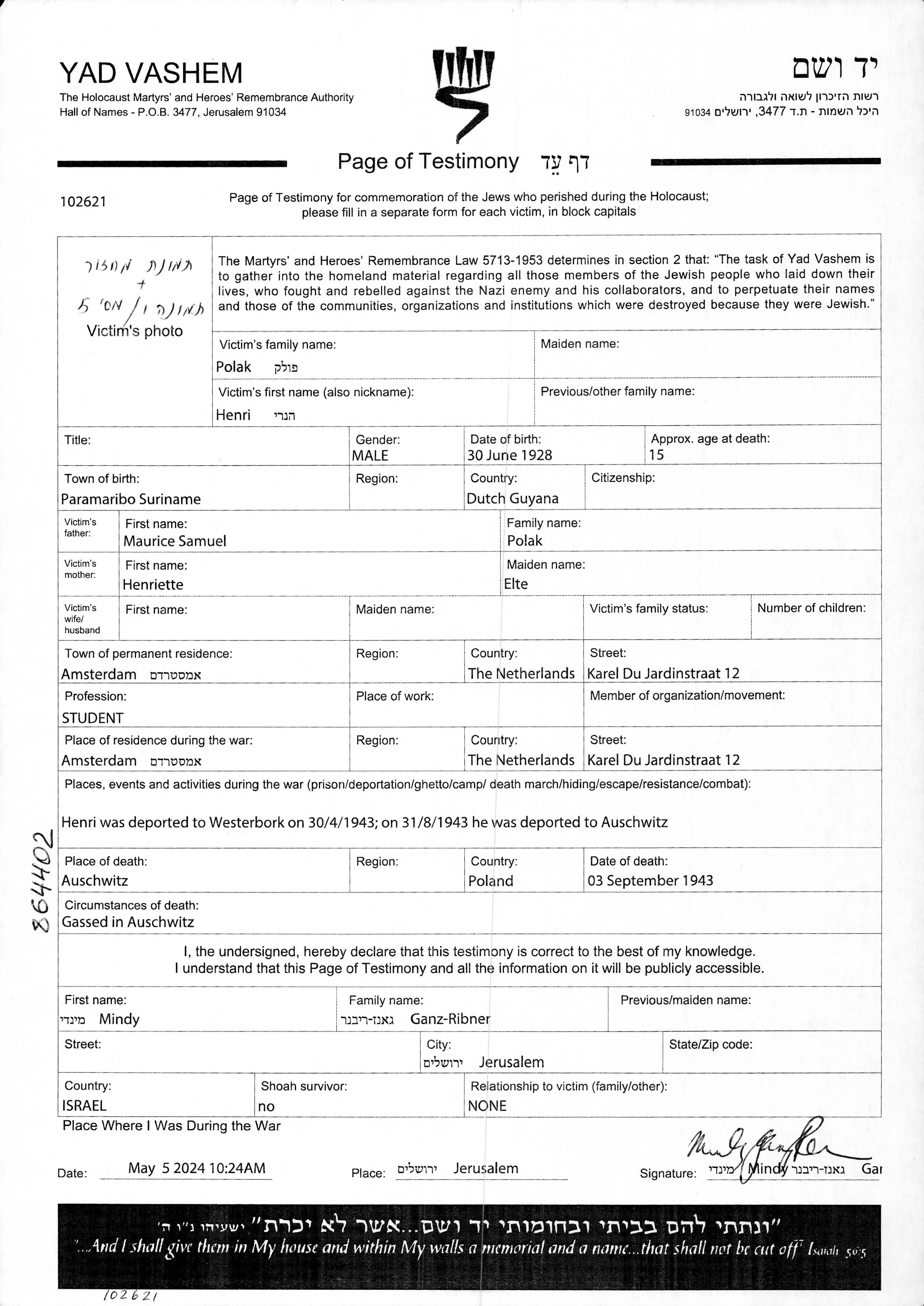 Генри Поляк, место рождения: Парамарибо, Суринам (Нидерланды). Отец: Морис Самуэль, mать:Хенриетте, девичья фамилия Элте. Студент / студентка. Ребенок. Место жительства до войны: Амстердам, Нидерланды. Место во время войны: Амстердам, Нидерланды. Депортация: Transport from Westerbork,Camp,The Netherlands to Auschwitz Birkenau,Extermination Camp,Poland on 31/08/1943.