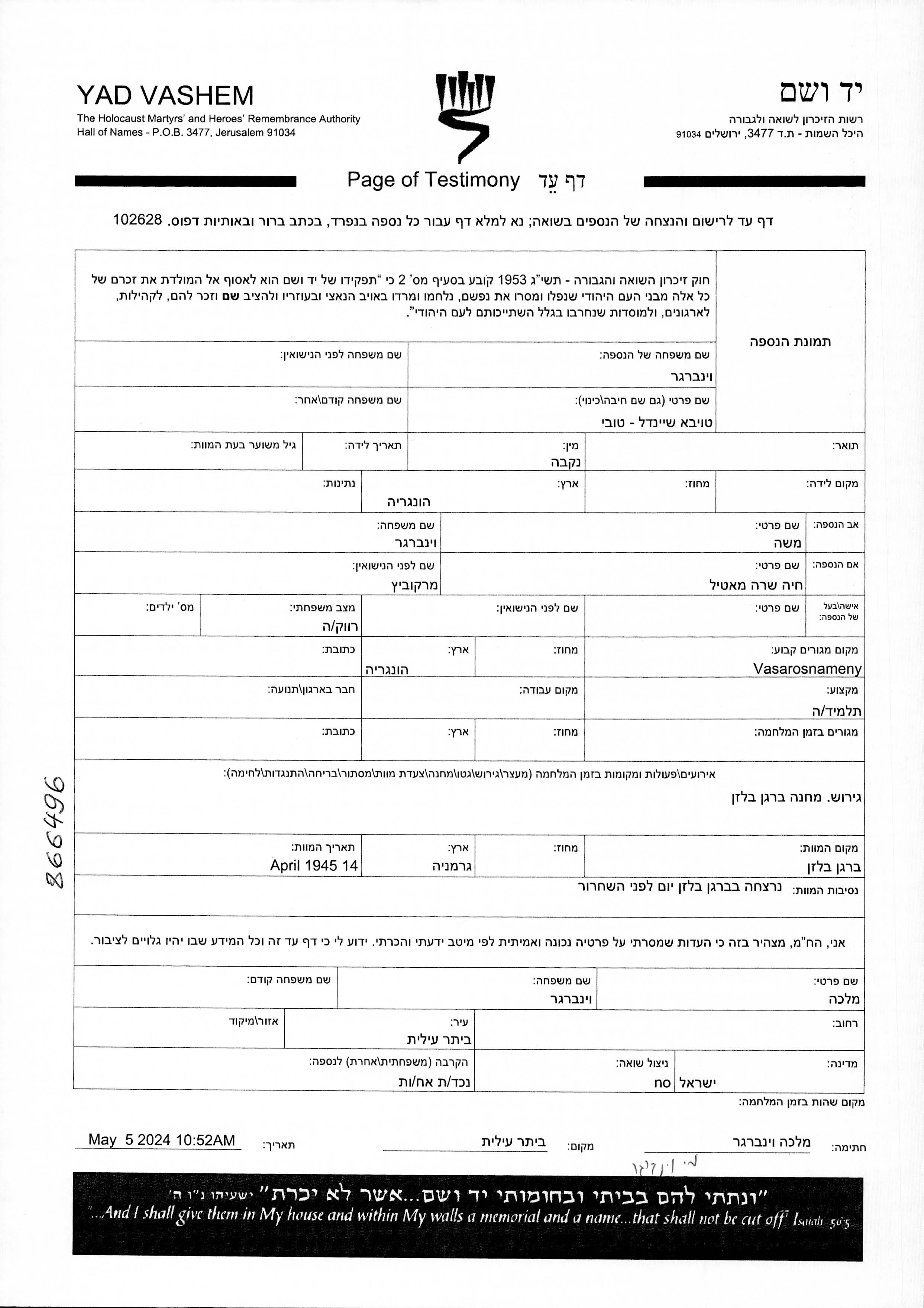 Тойбе Шейндель Тоби Вайнбергер, место рождения: Венгрия. Отец: Моше, mать:Хая Сара Матиль, девичья фамилия Марковиц. Ученик / ученица. Холост / не замужем. Место жительства до войны: Вашарошнамень, Венгрия.