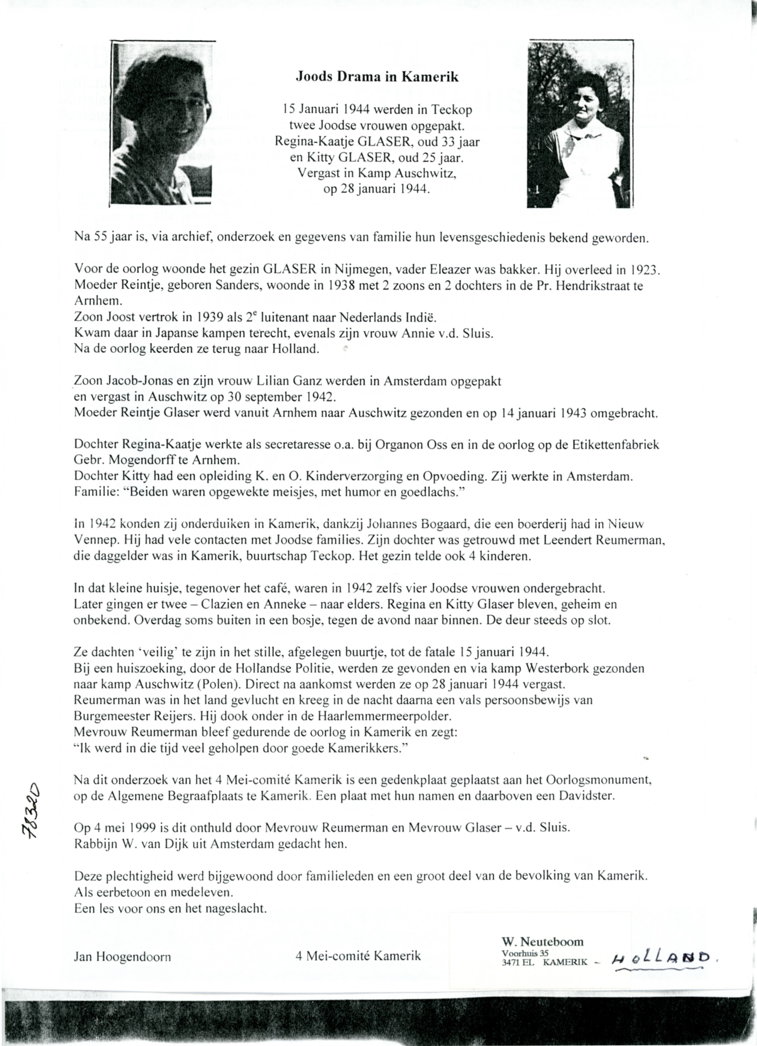 Китти Гласер Элеазер Рейнтье девичья фамилия Сандерс. Место жительства до войны: Амстердам, Нидерланды. Место во время войны: Камерик, Нидерланды.