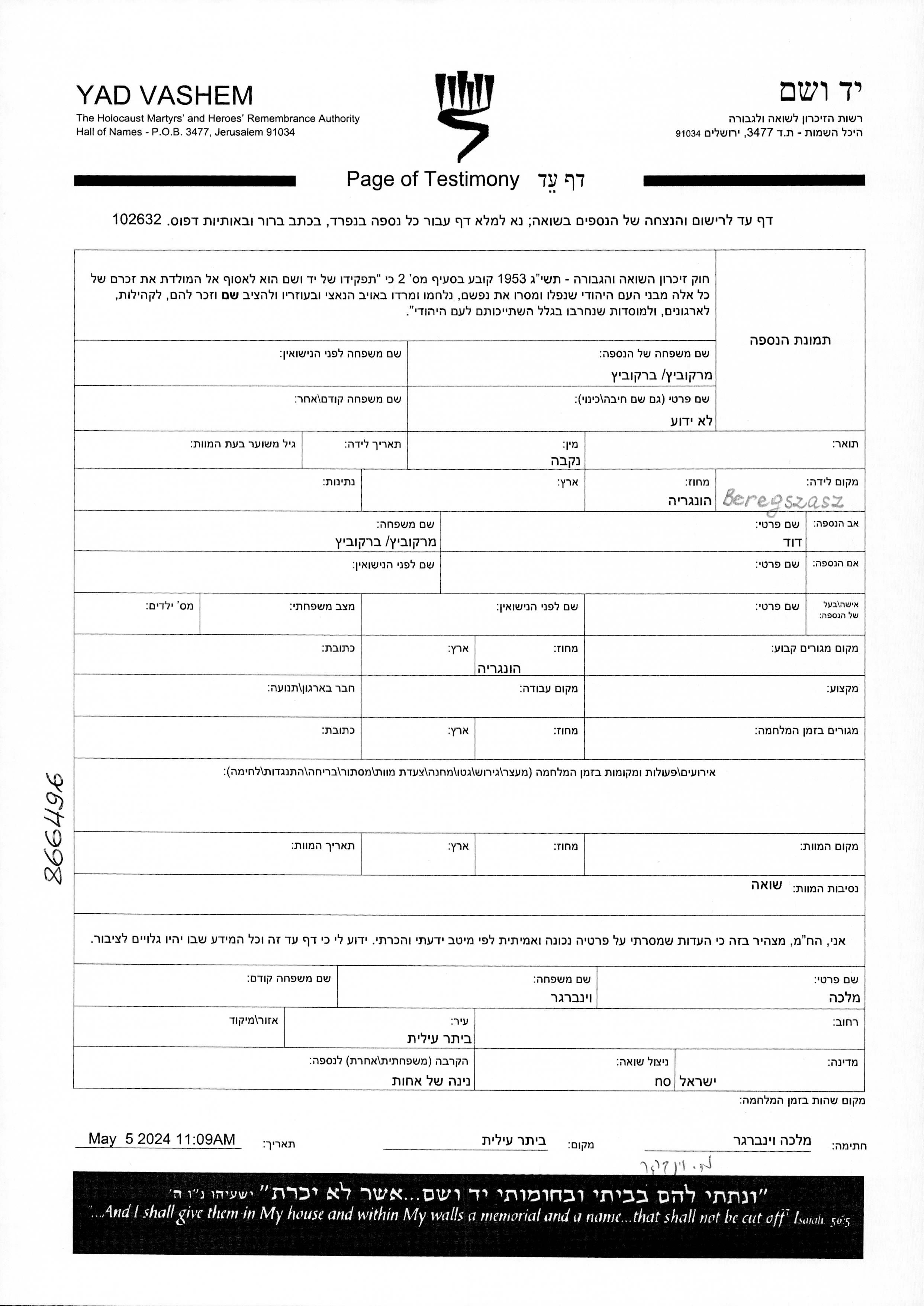 Имя неизвестно Марковиц Берковиц, место рождения: Берегсас, Чехословакия. Отец: Давид. Место жительства до войны: Венгрия.