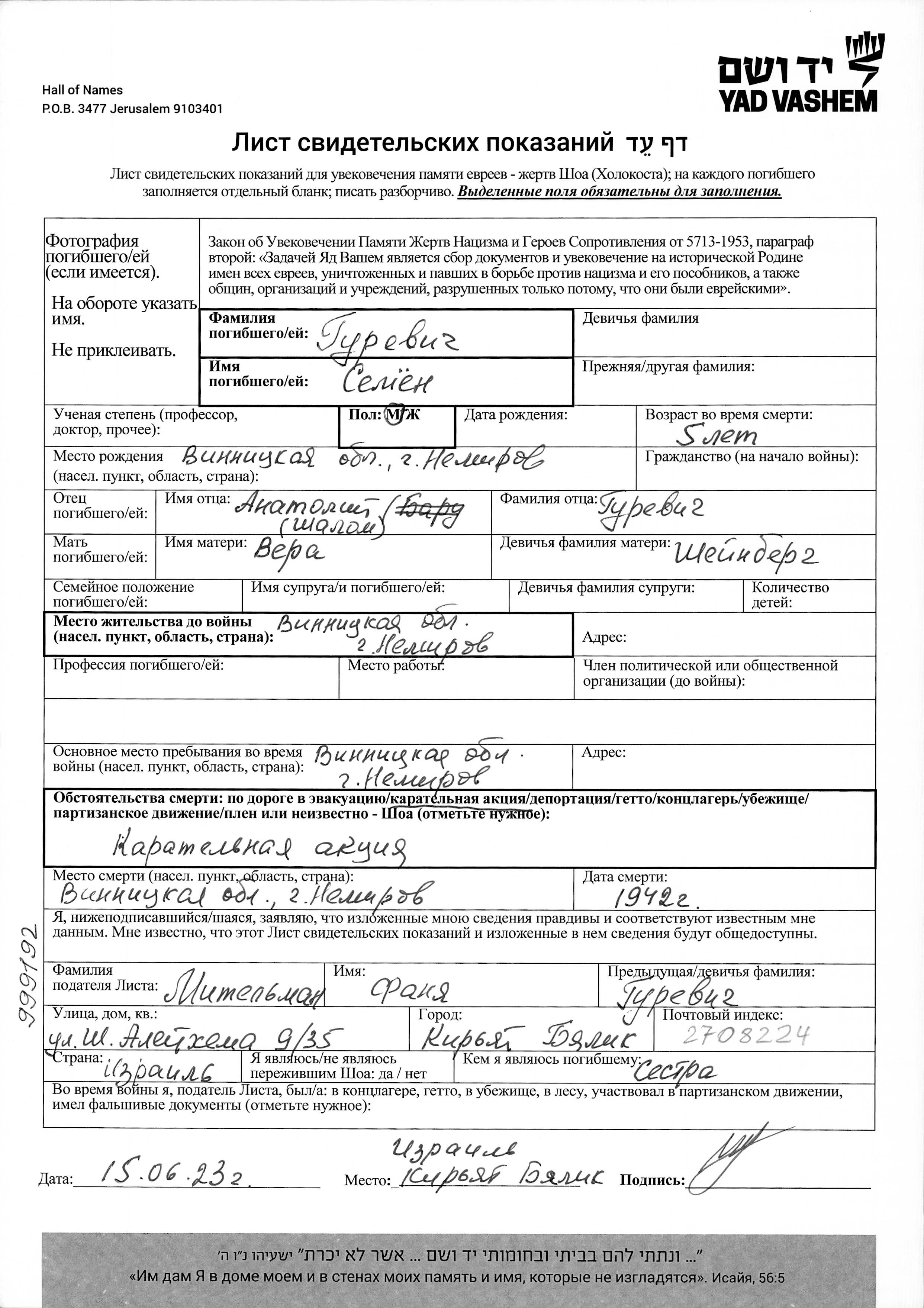 Гуревич Сёма 1937 Немиров, Украина (СССР) Лист свидетельских показаний