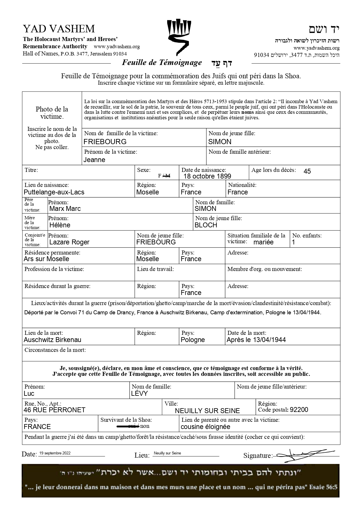 Фрибург | Жан | 1899 | Ars-sur-Moselle, France | Лист свидетельских показаний |