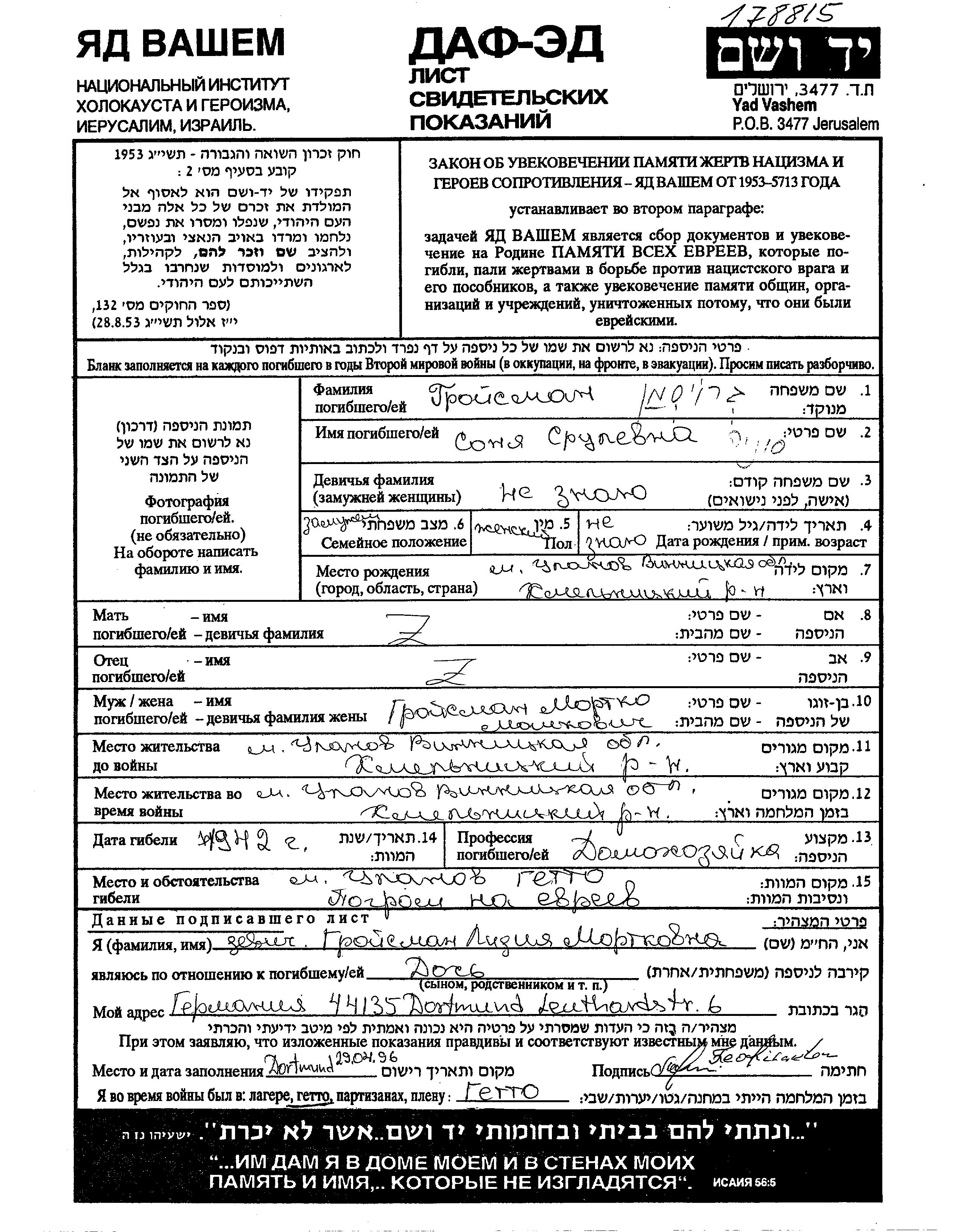 Гройсман Соня Уланов, Украина (СССР) Лист свидетельских показаний