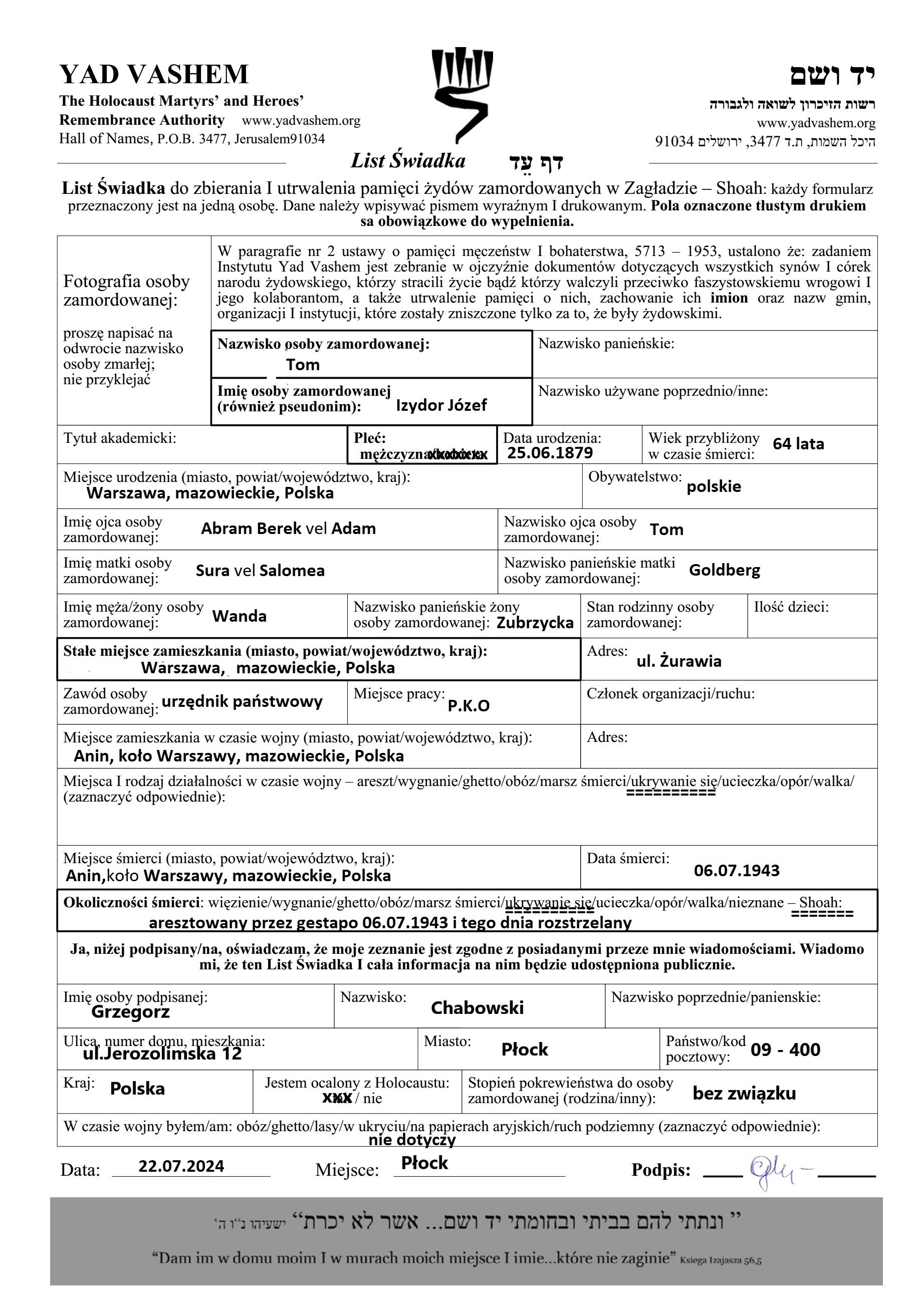 Изидор Юзеф Том, место рождения: Варшава, Польша. Государственный служащий. Место жительства до войны: Варшава, Польша. Изидор Юзеф уничтожен в период Шоа. место смерти: Анин, Польша в 06/07/1943.