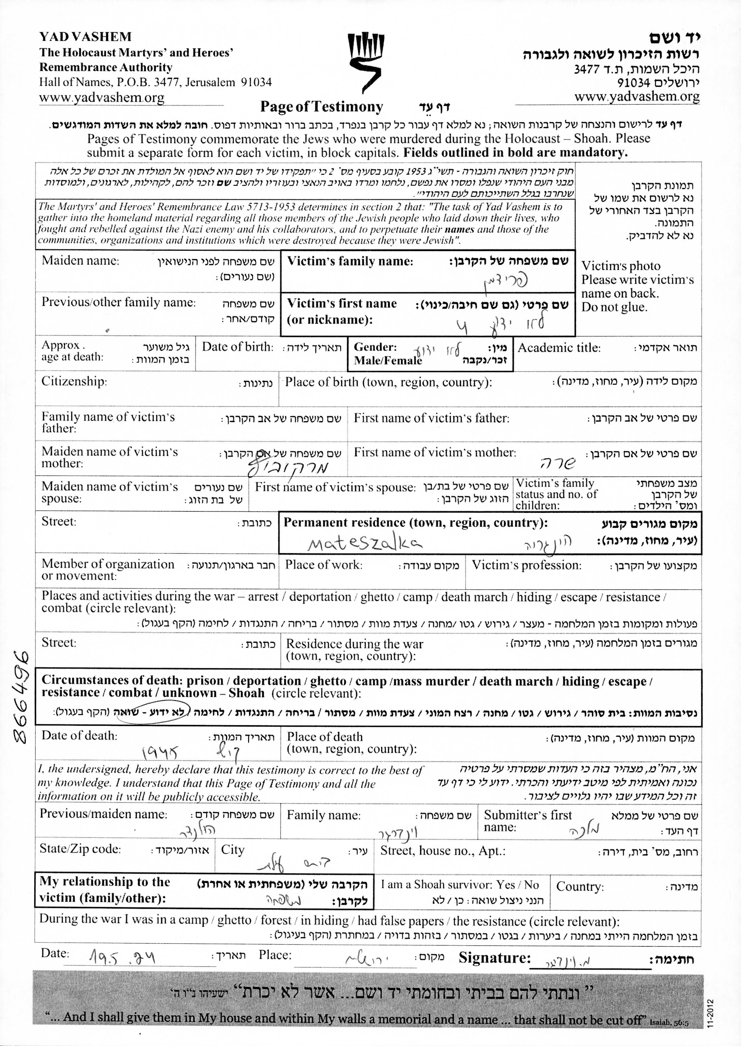 Яд Вашем - Листы свидетельских показаний Мемориального фонда