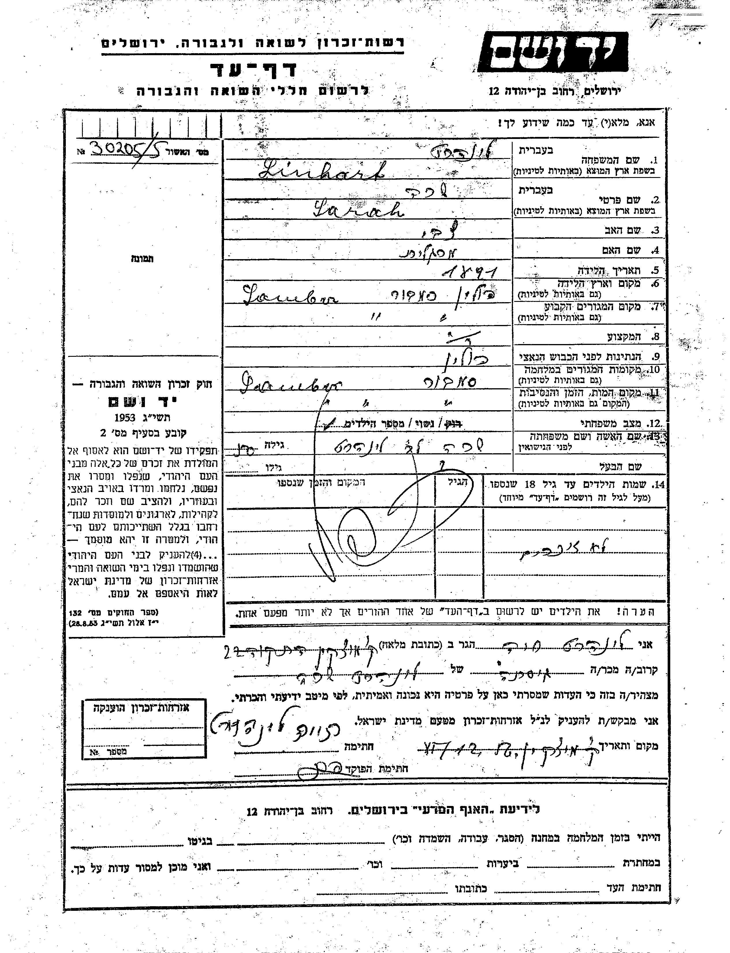 Сара Линхарт, место рождения: Самбор, Польша. Место жительства до войны: Самбор, Польша.