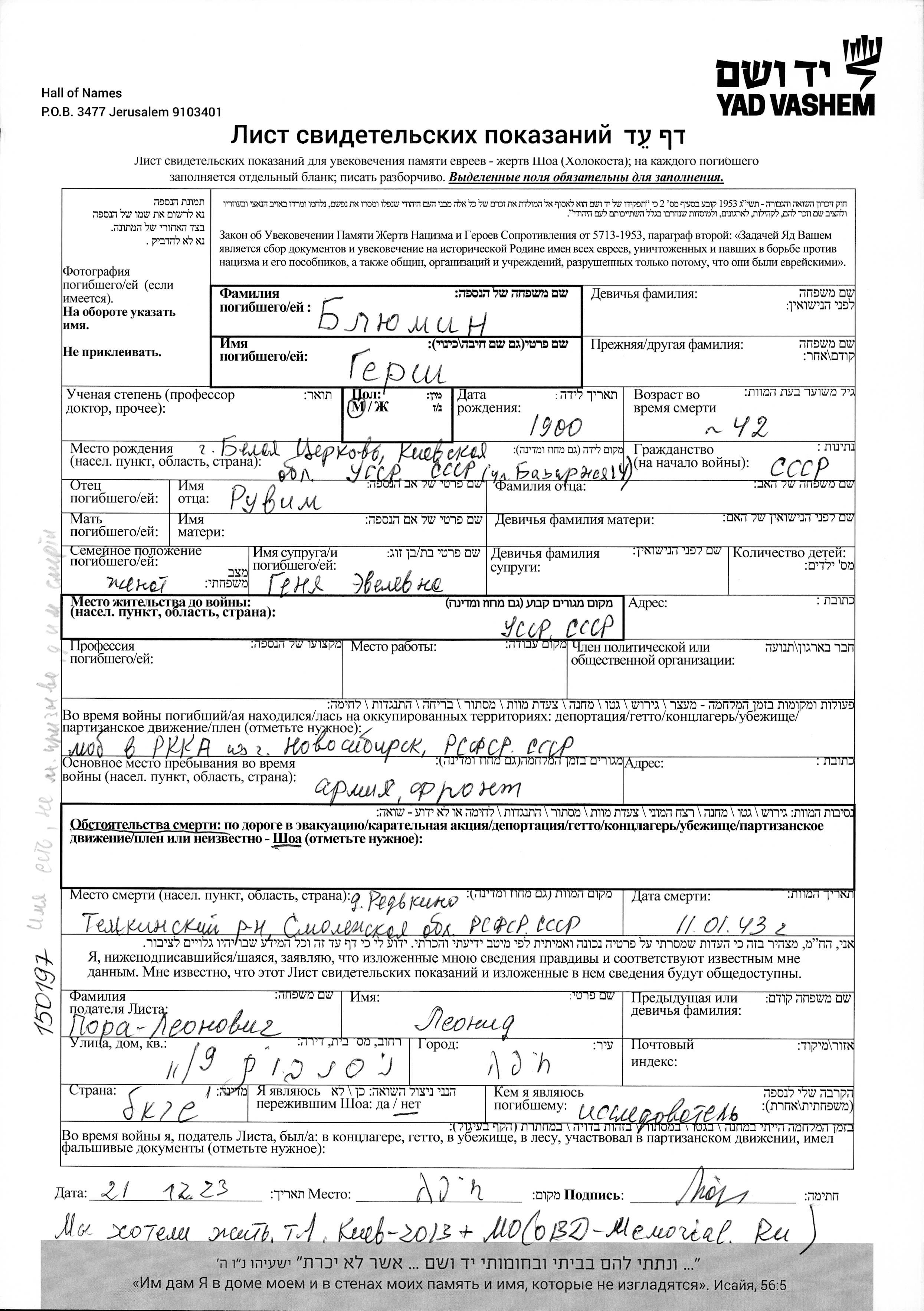 | Блюмин | Герш | 1902 | Киев, Украина (СССР) | Лист свидетельских показаний |