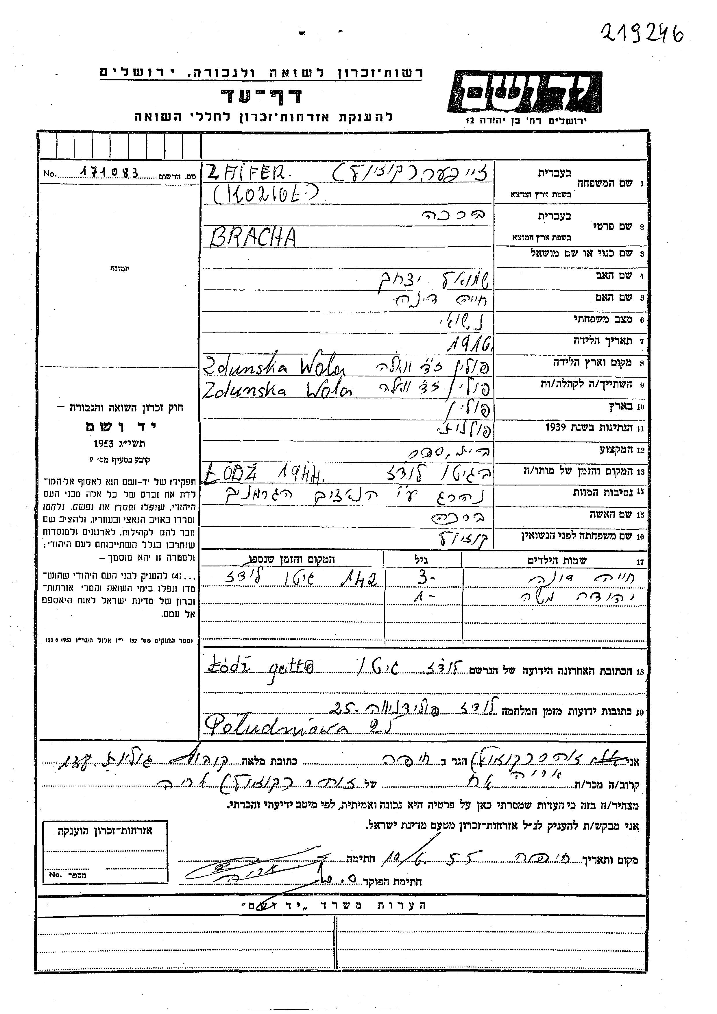 Браха уничтоженa в период Шоа. место смерти: Хелмно, Польша в 1943.
