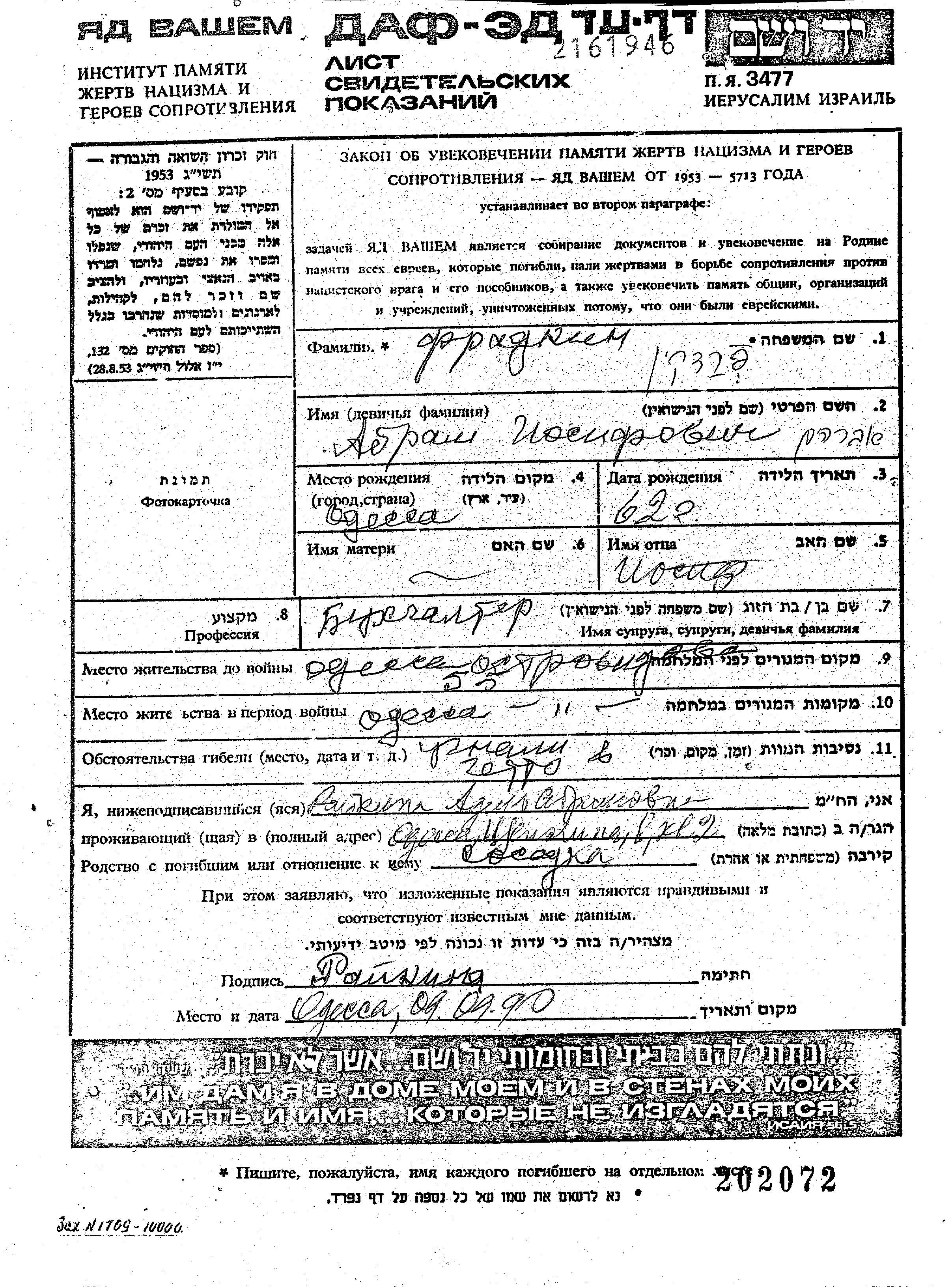 Фрадкин Аврум Шмиль 1876 Одесса, Украина (СССР) Лист свидетельских показаний