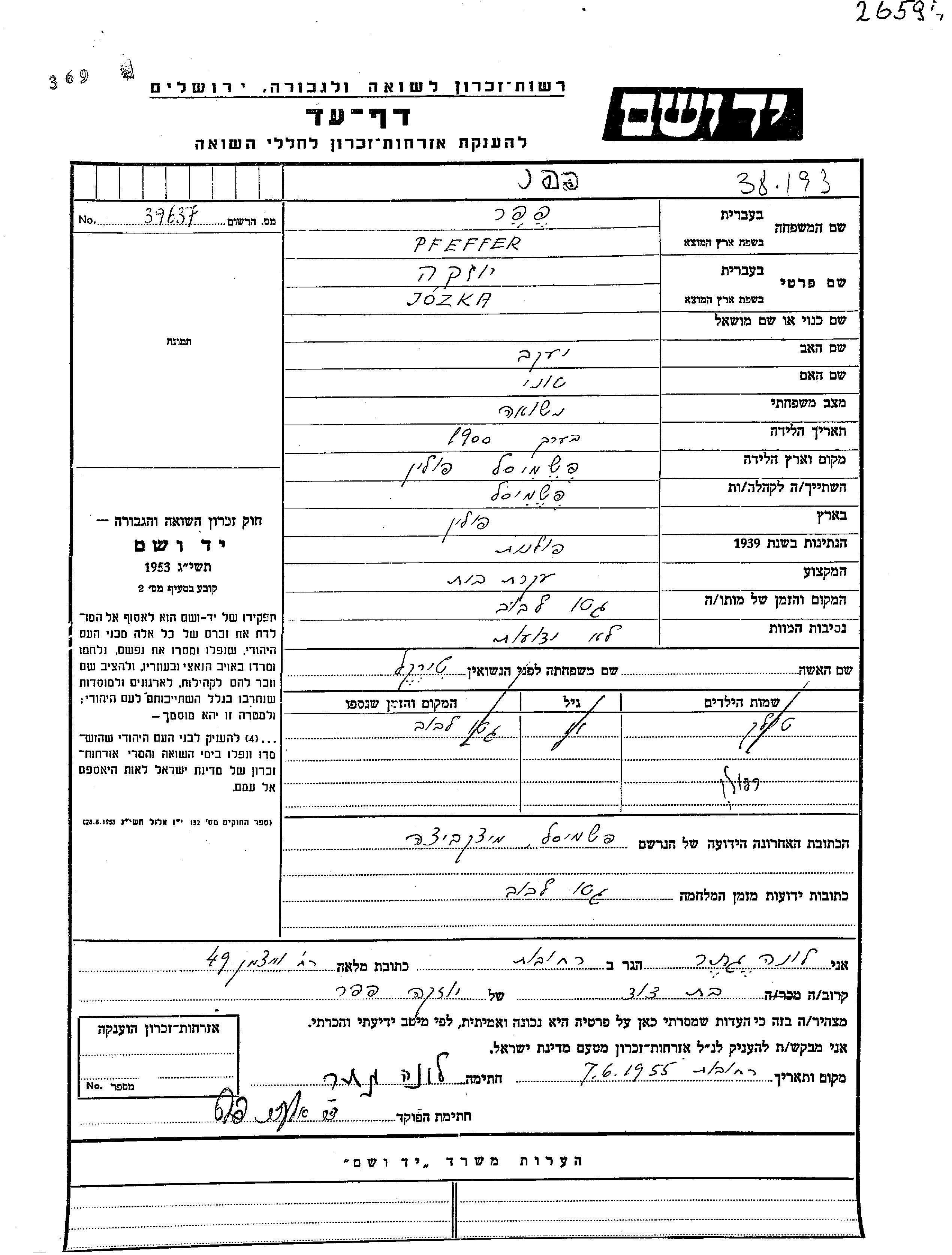 Йозка Феффер, девичья фамилия Тиркель, место рождения: Пшемысль, Польша. Домохозяйка. Место жительства до войны: Пшемысль, Польша.