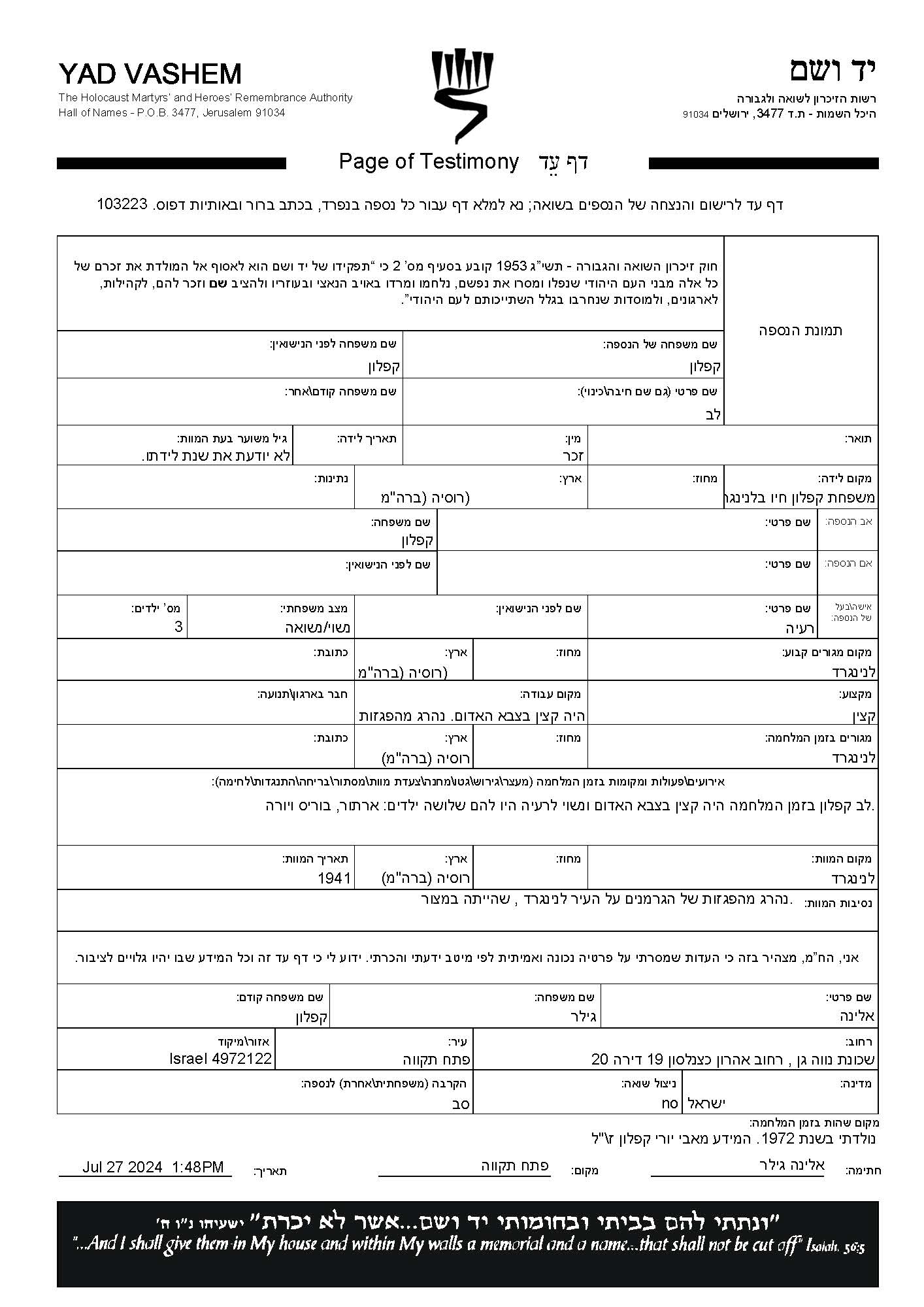 Каплун Лев Ленинград, Россия (СССР) Лист свидетельских показаний (электронный)
