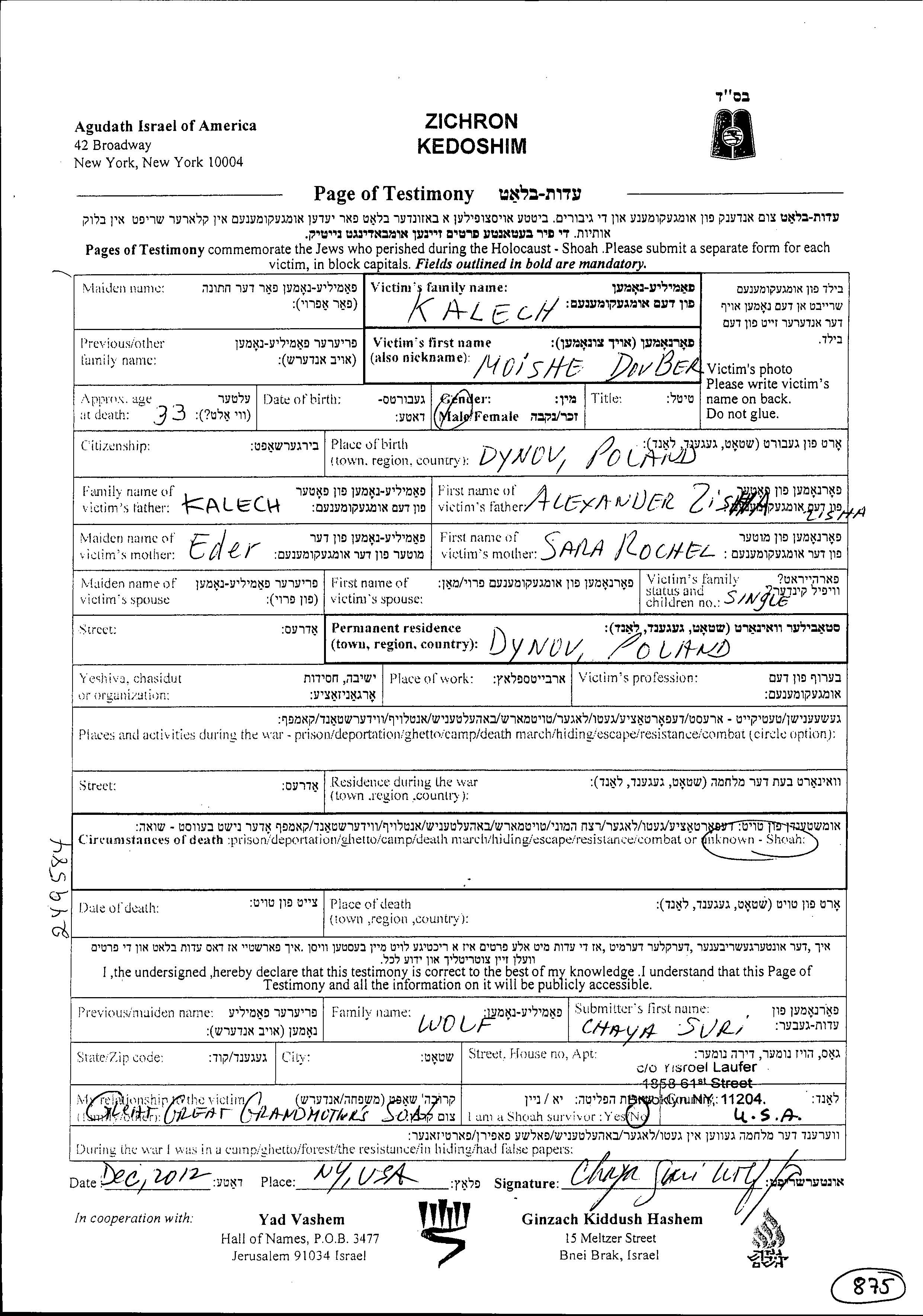 Калех | Мойше Дов Бер | Динов, Польша | Лист свидетельских показаний | |