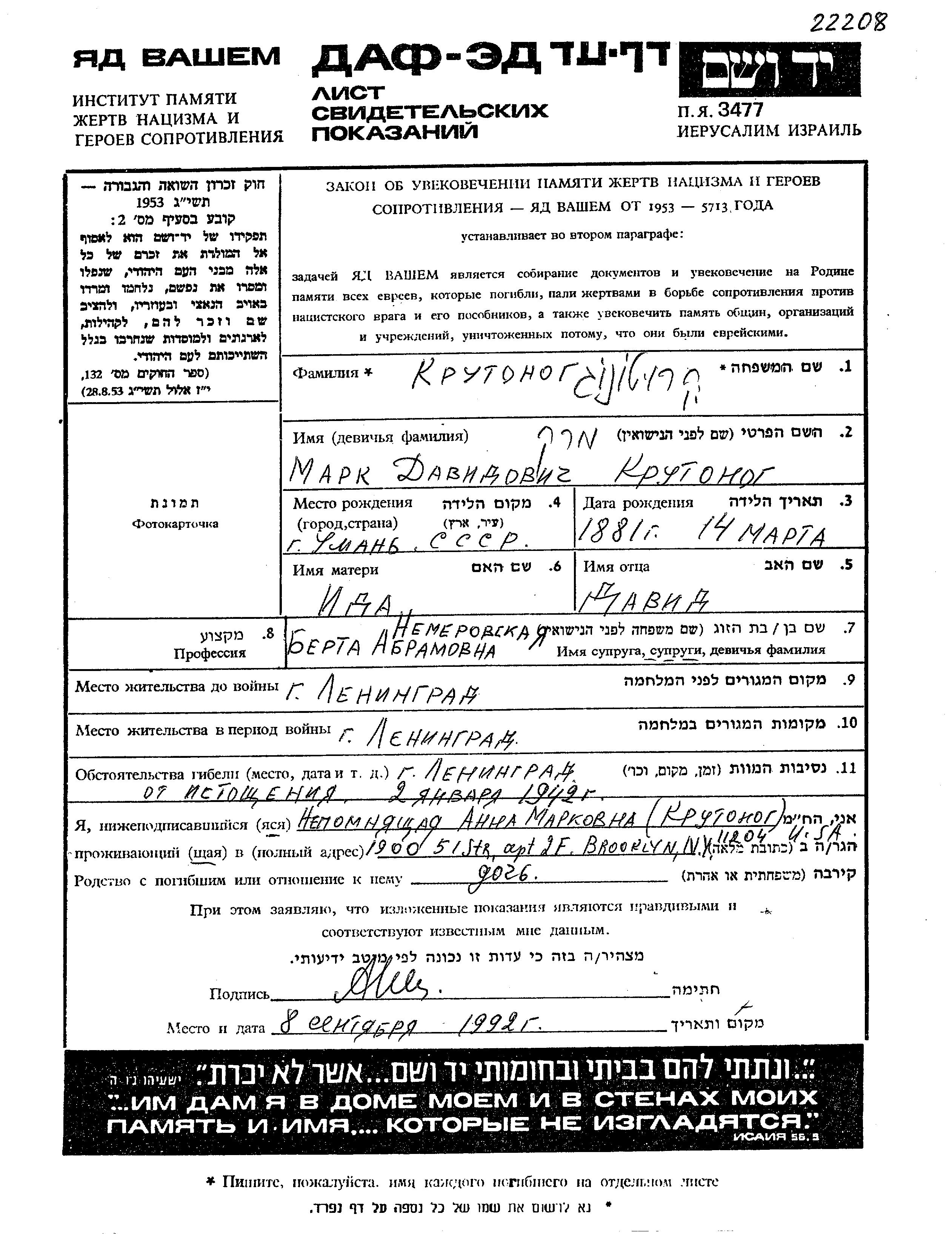 Крутоног | Марк | 1881 | Ленинград, Россия (СССР) | Лист свидетельских показаний |