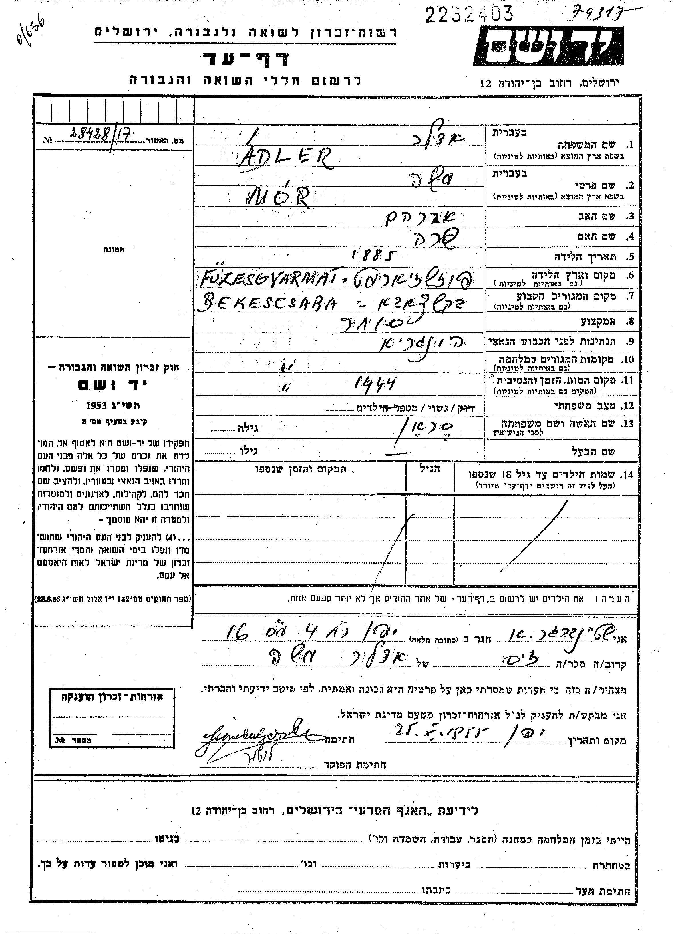 Мор Моше Адлер, место рождения: Фюзешдьярмат, Венгрия. Торговец / торговка. Место жительства до войны: Бекешчаба, Венгрия.