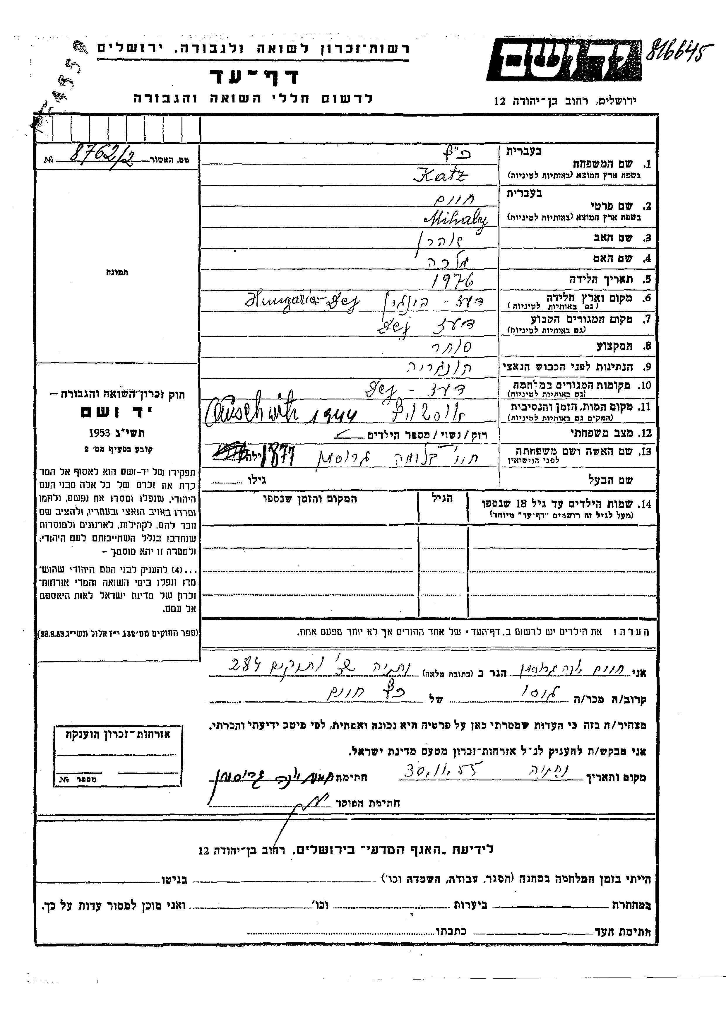 Яд Вашем - Листы свидетельских показаний Мемориального фонда