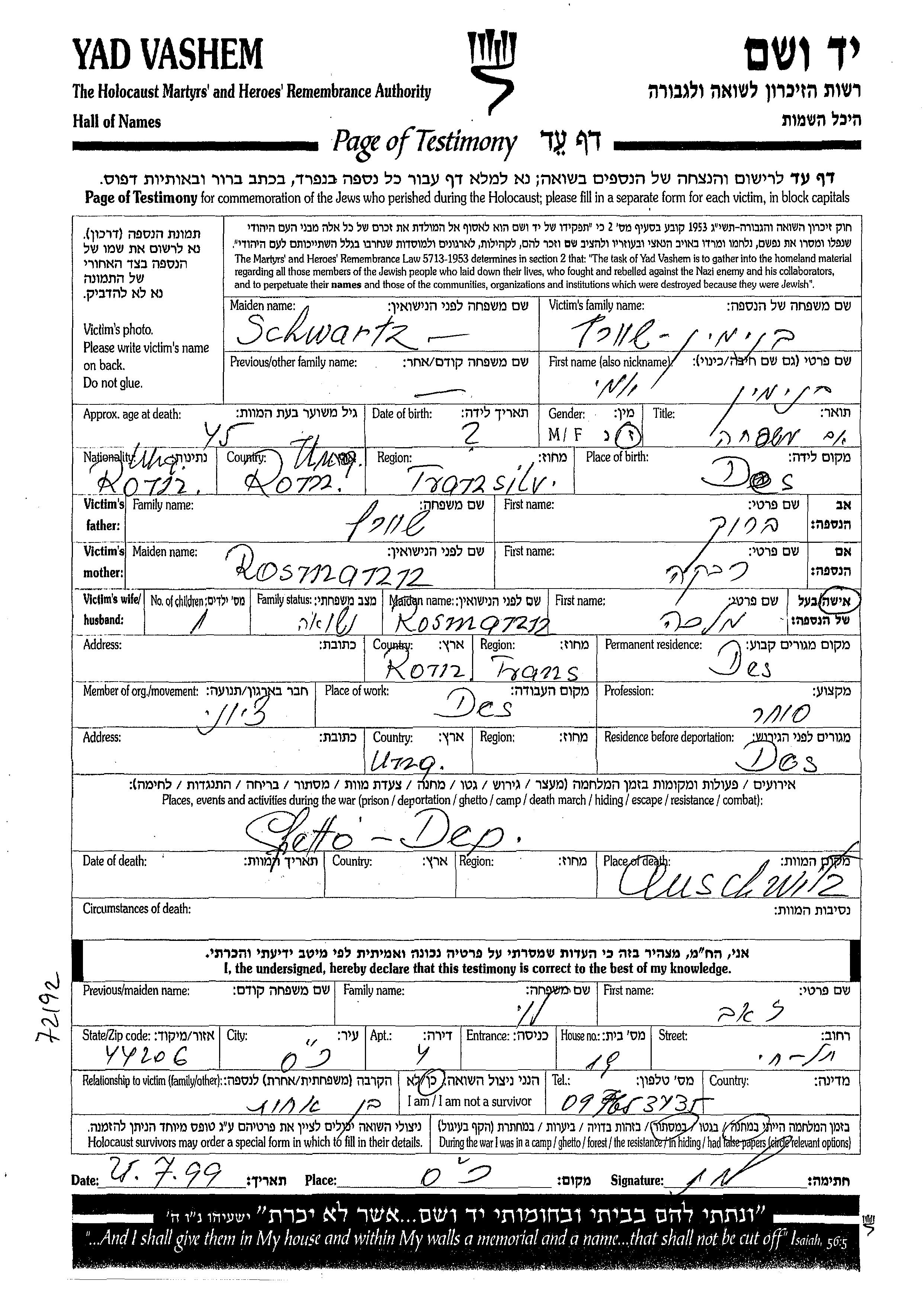 Яд Вашем - Листы свидетельских показаний Мемориального фонда