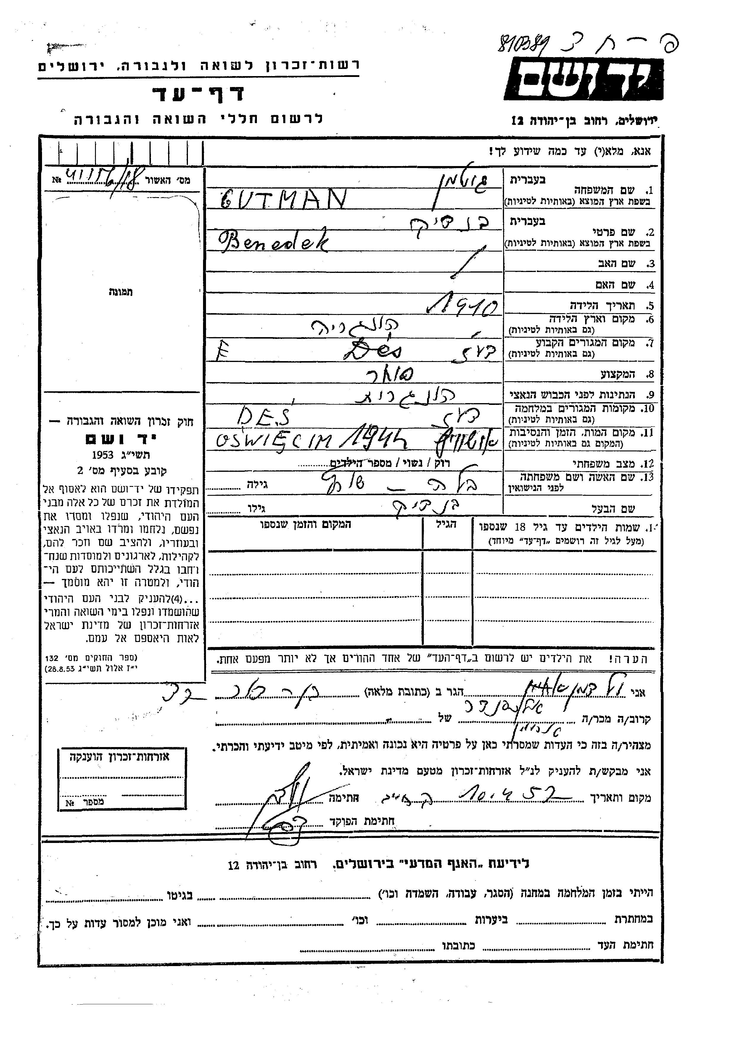 Гутман Бенедек 1910 Деж, Румыния Лист свидетельских показаний