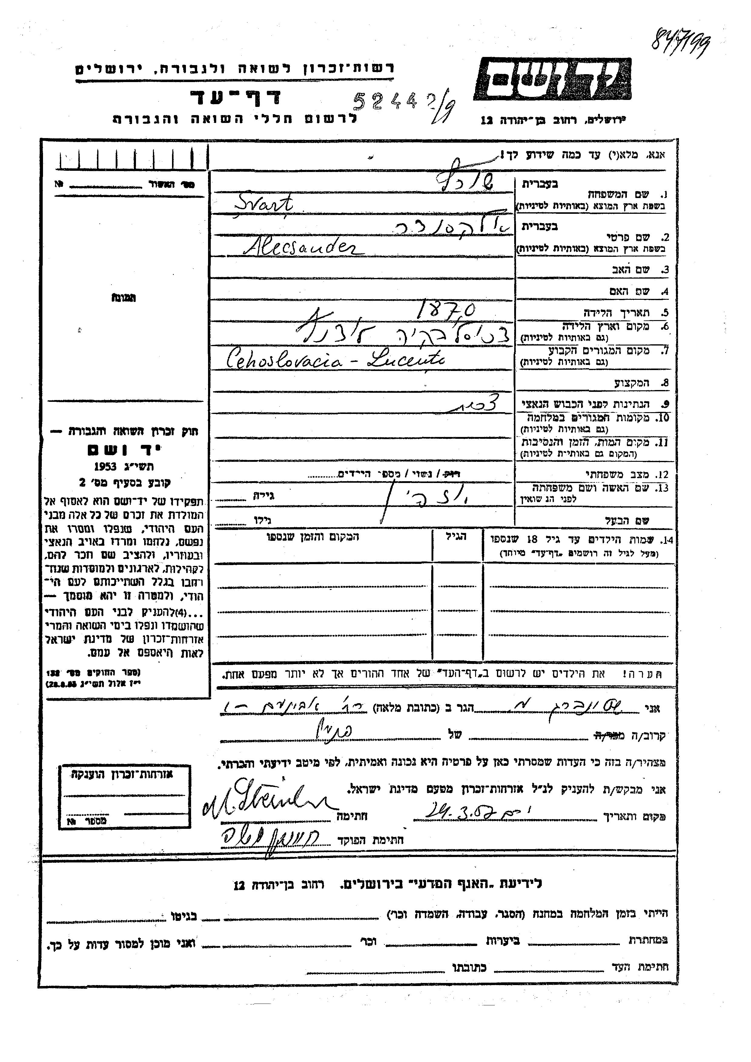Сварт Шварц Александер 1870 Лученец, Чехословакия Лист свидетельских показаний