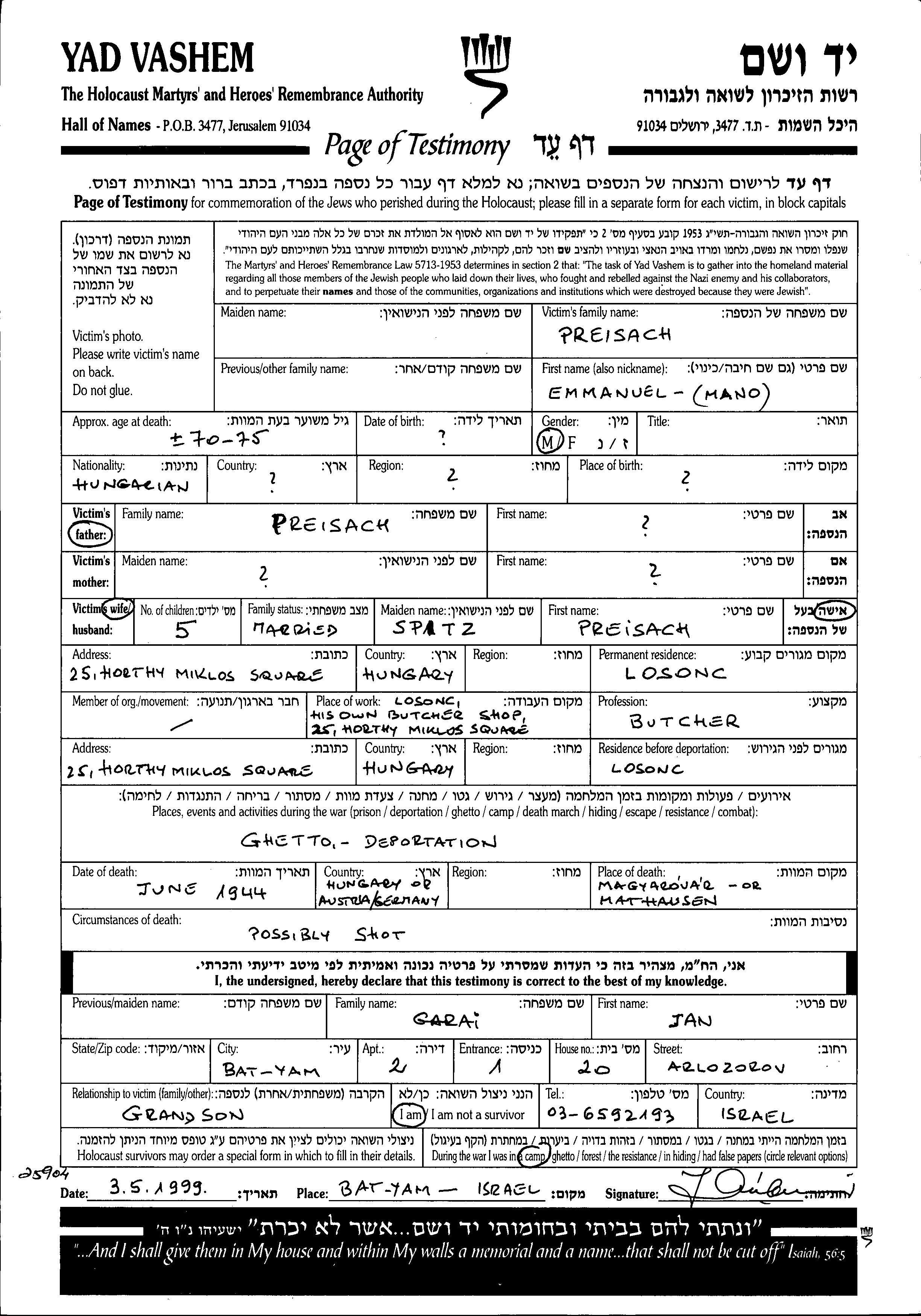 Прайзах | Эммануэль | Лошонц, Чехословакия | Лист свидетельских показаний | |