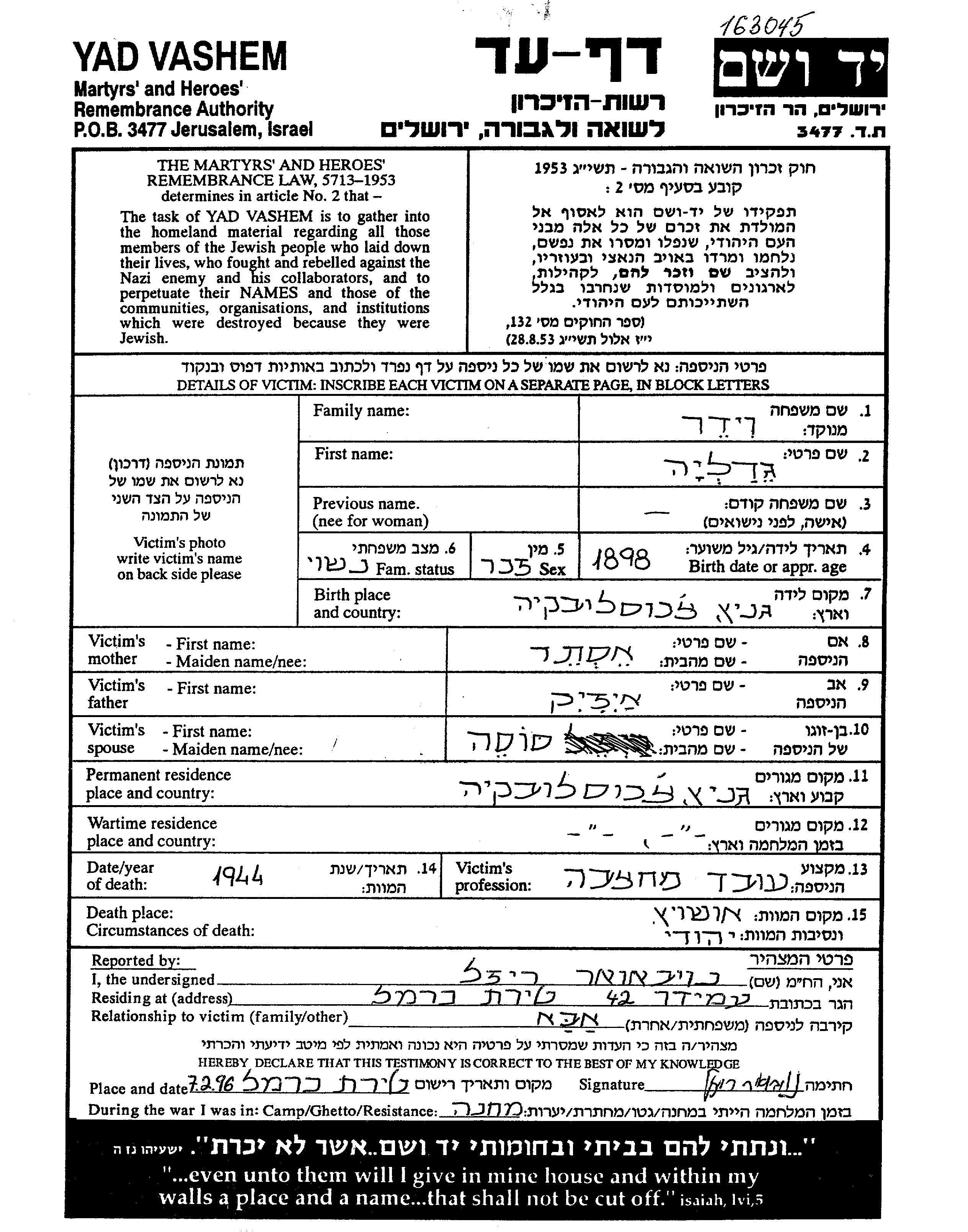 | Видер | Гедалья | 1889 | Ганиче, Чехословакия | Лист свидетельских показаний |