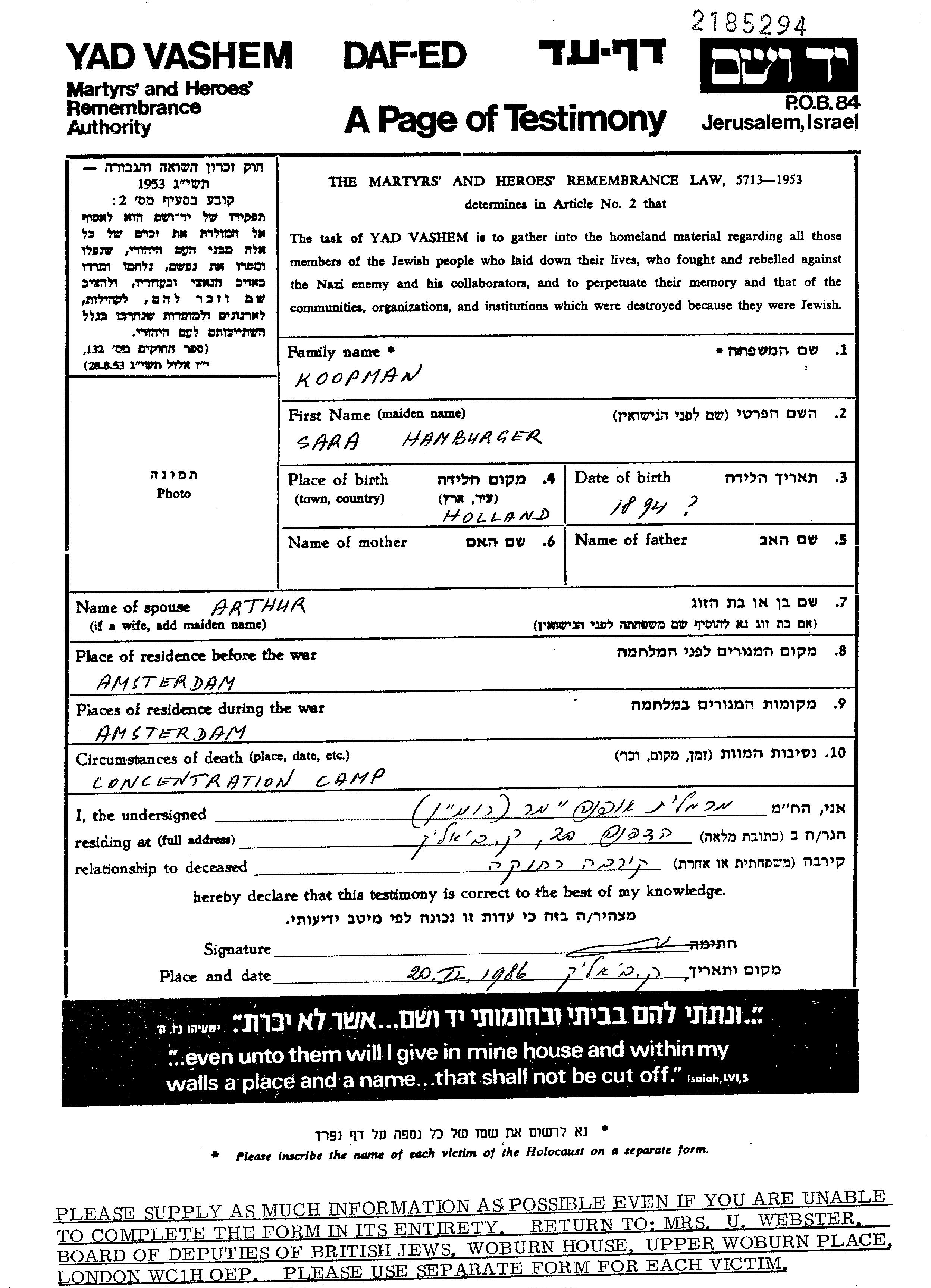 Копман Кофман Сара 1894 Амстердам, Нидерланды Лист свидетельских показаний