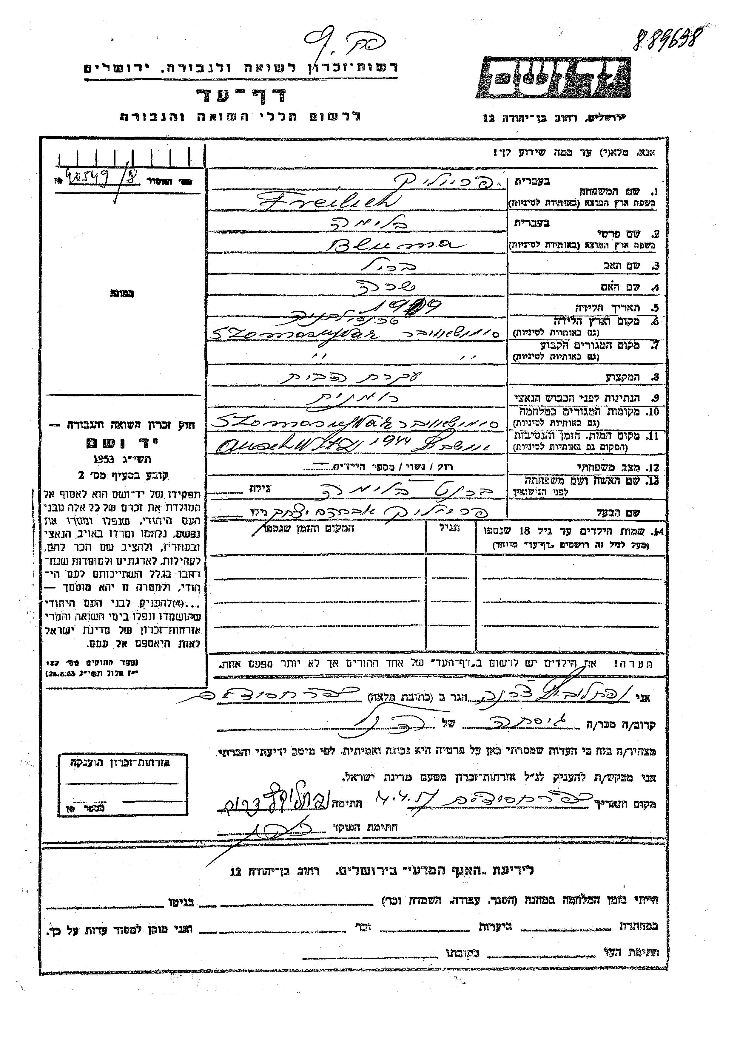Фрайлих Блима 1909 Самошуйвар, Румыния Лист свидетельских показаний