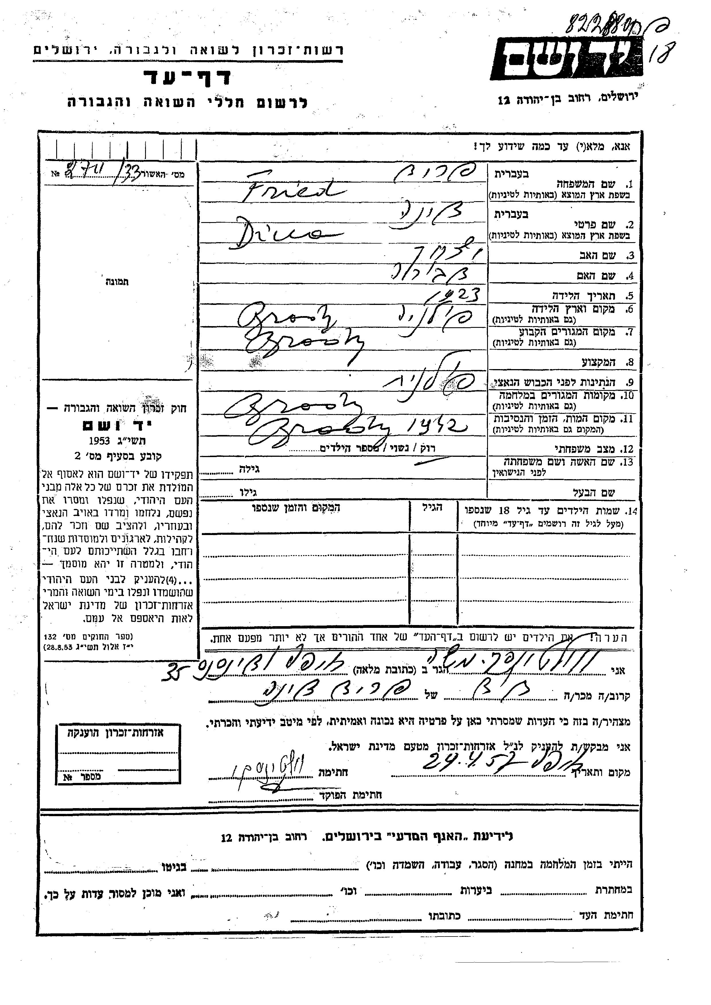 Дина Фрид, место рождения: Броды, Польша. Отец: Ицхак, mать:Двора. Холост / не замужем. Место жительства до войны: Броды, Польша. Место во время войны: Броды, Польша.