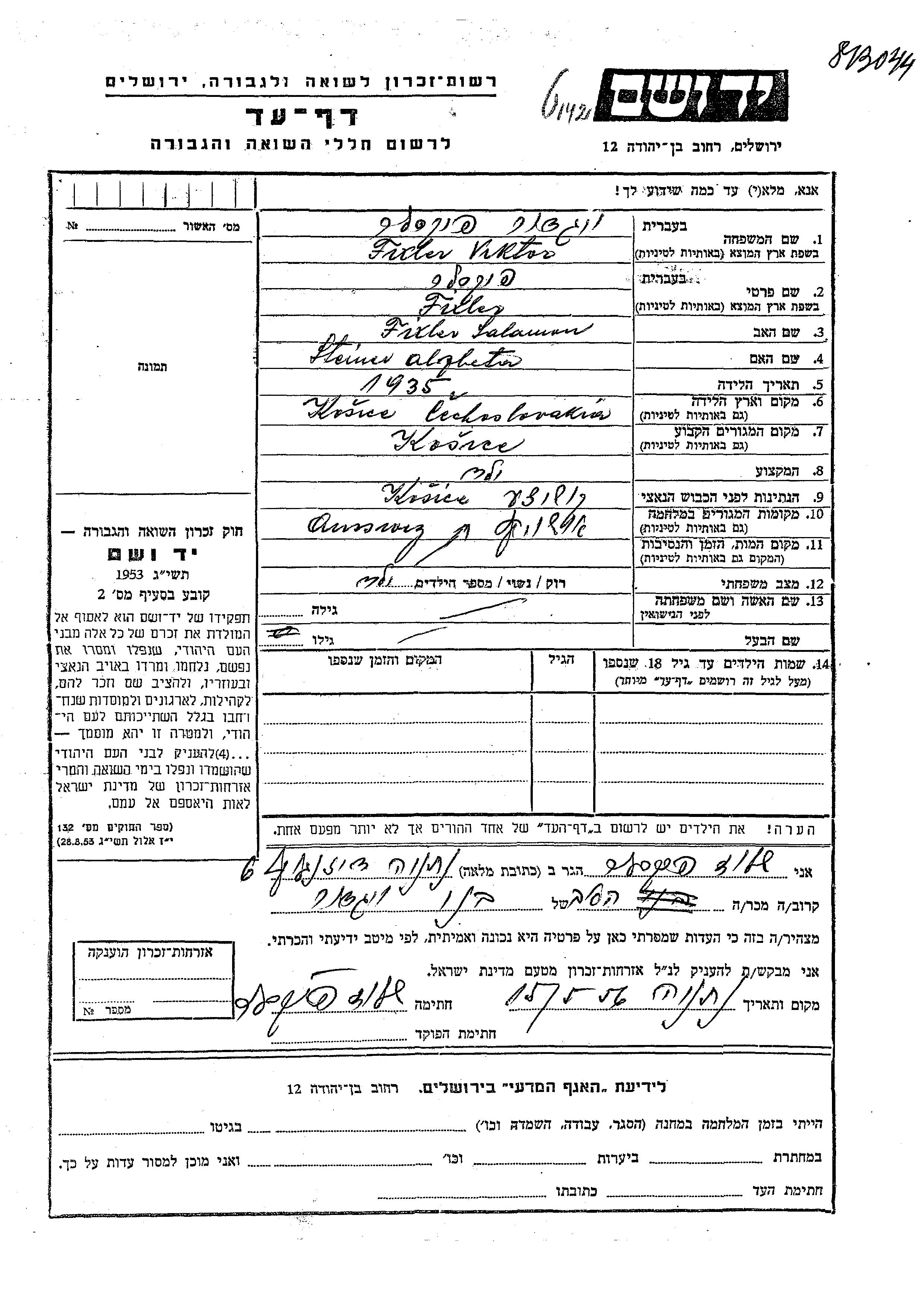 Фикслер Вигдор Виктор 1935 Кошице, Чехословакия Лист свидетельских показаний