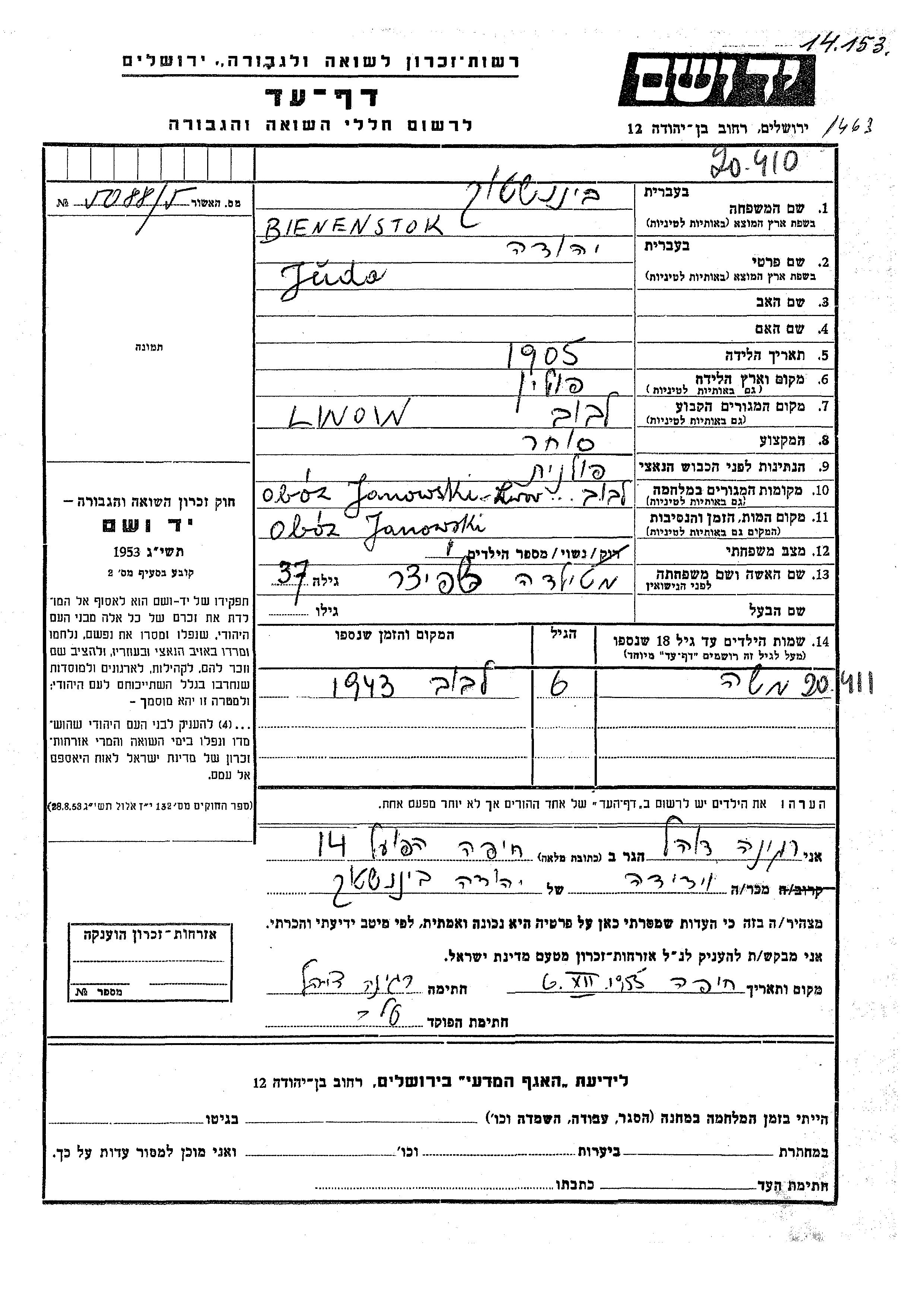 Юда Бененшток, место рождения: Польша. Торговец / торговка. Женат / замужем. Место жительства до войны: Львов, Польша. Место во время войны: Львов, Польша.