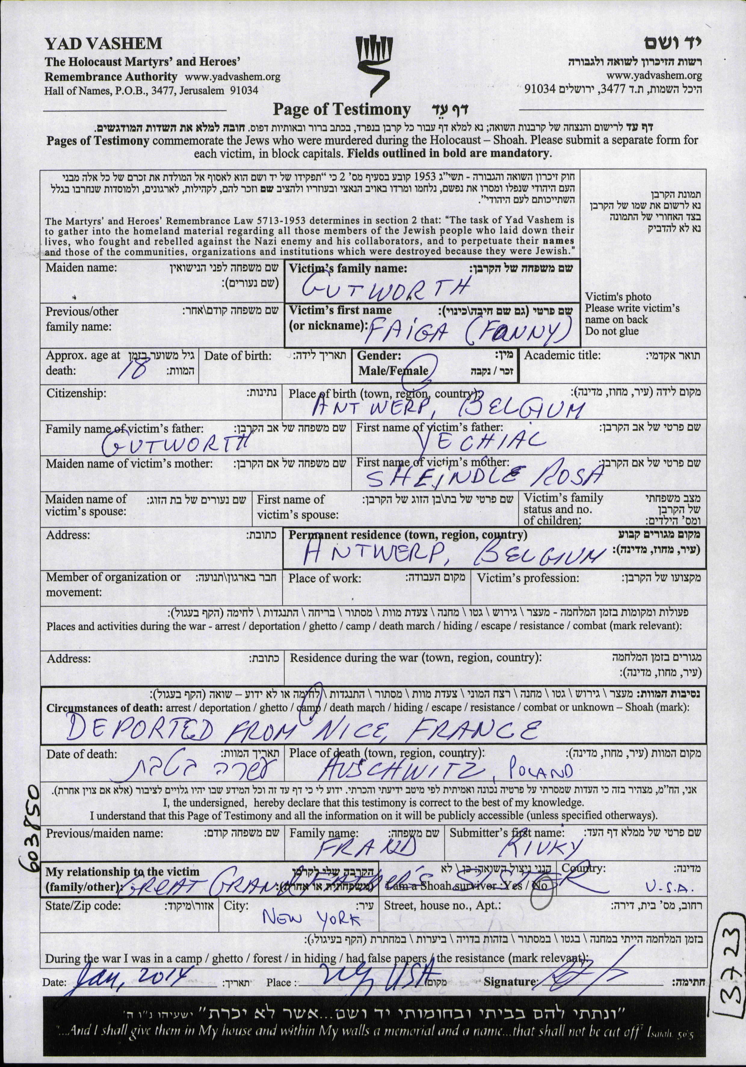 Гутворт Файга Фанни Антверпен, Бельгия Лист свидетельских показаний
