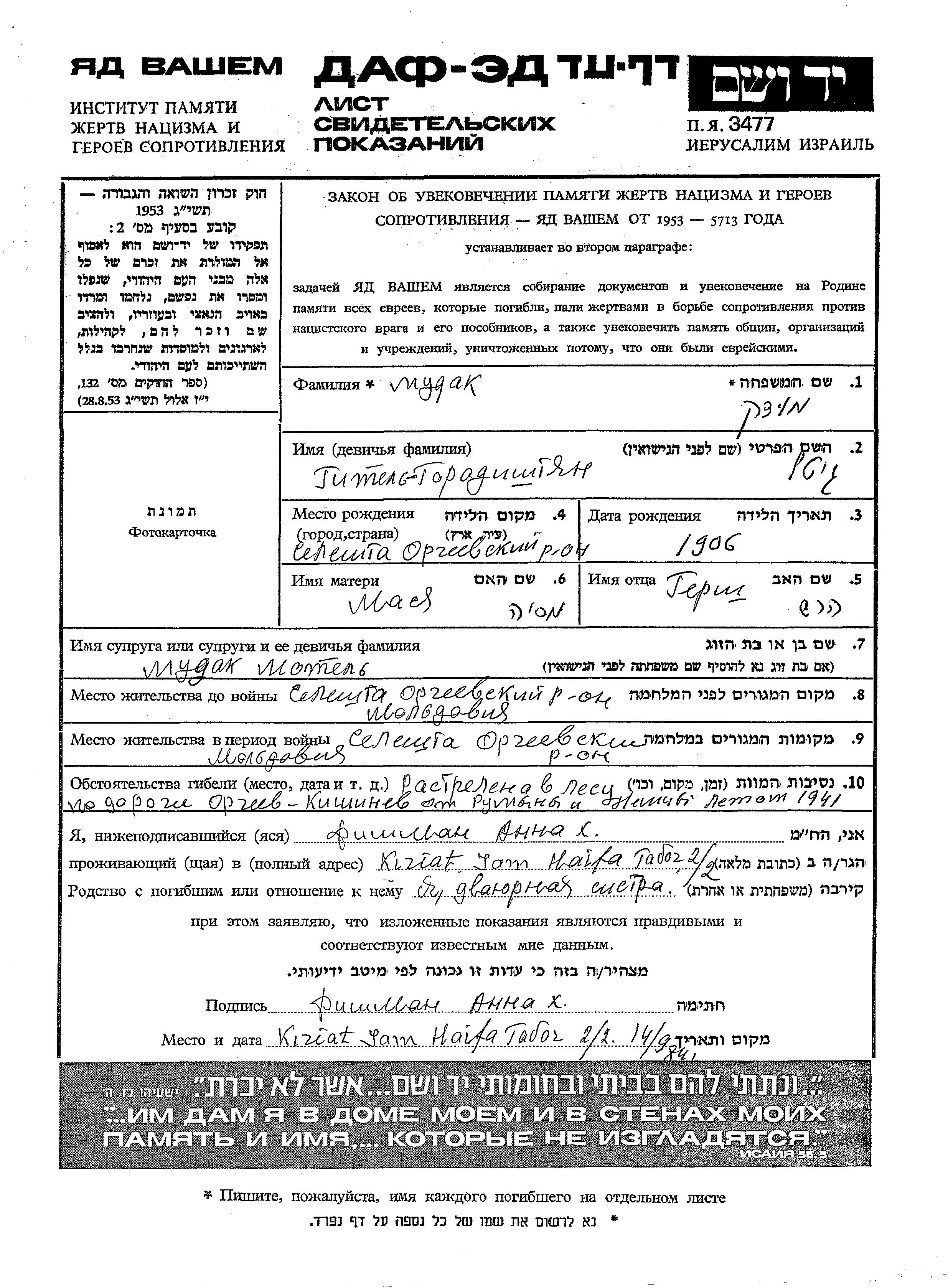 Гитель Мудак, девичья фамилия Городиштян, место рождения: Селешть, Румыния. Место жительства до войны: Селешть, Румыния.