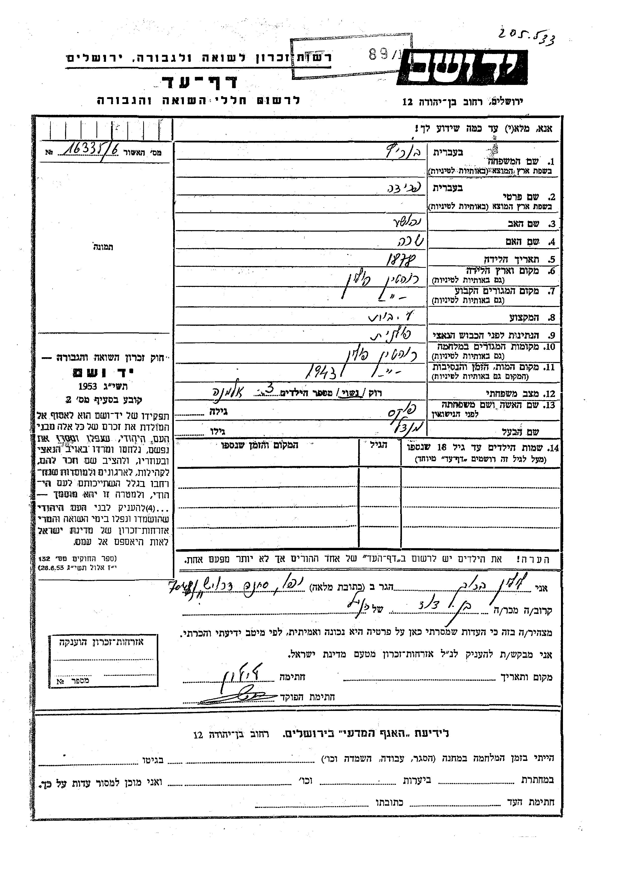 Яд Вашем - Листы свидетельских показаний Мемориального фонда