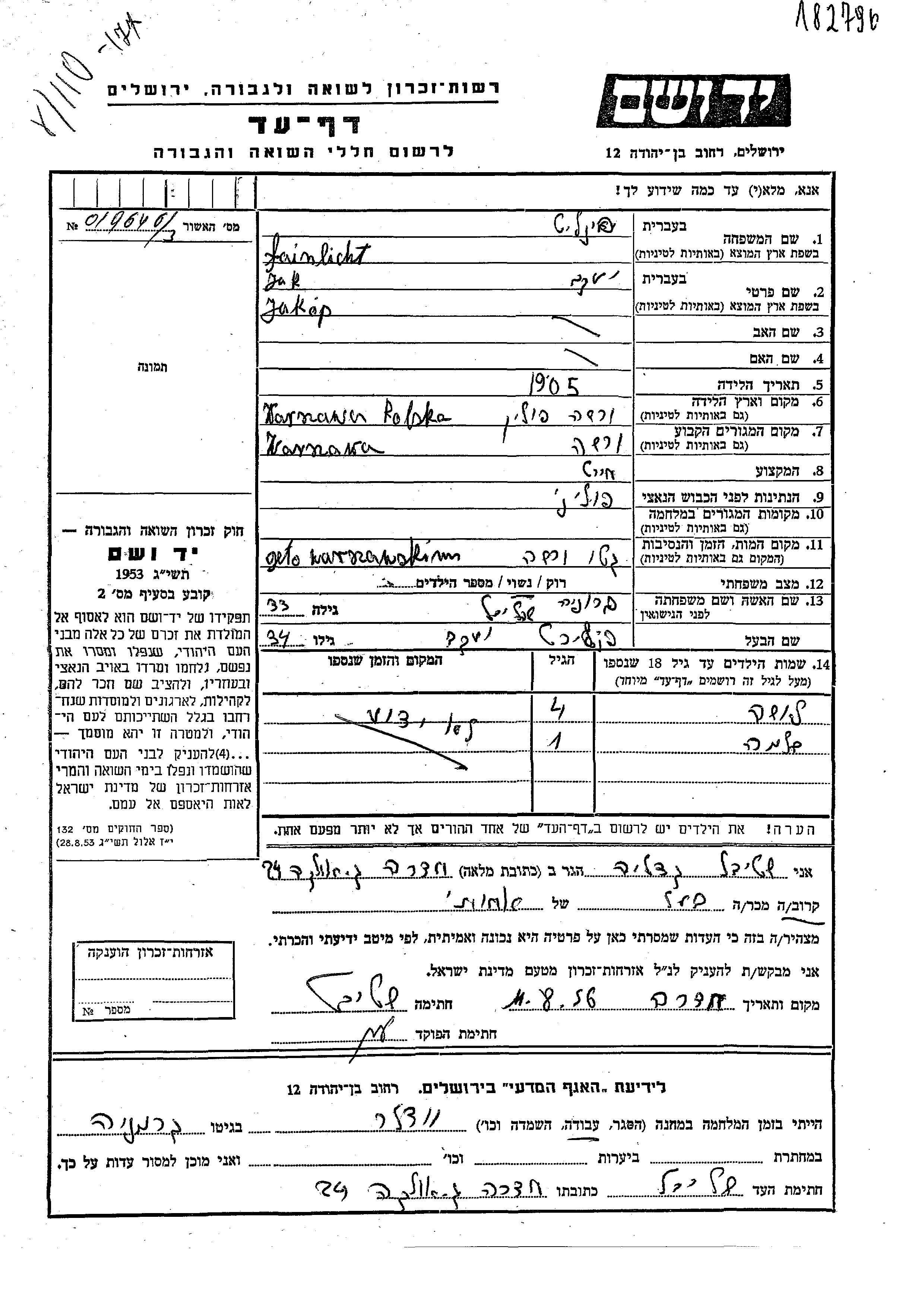 Фейнлихт Яков 1905 Варшава, Польша Лист свидетельских показаний