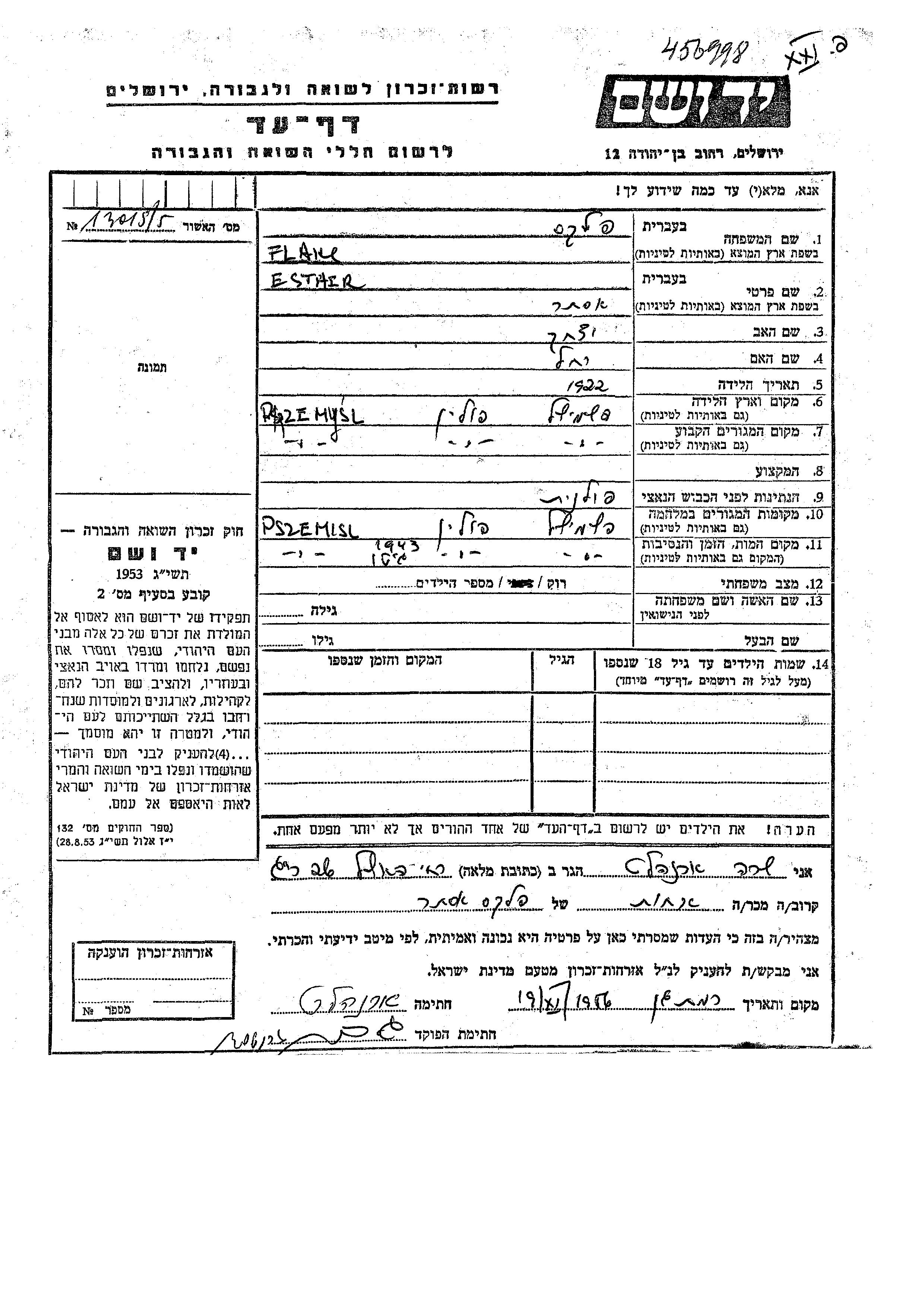 Эстер Флакс, место рождения: Пшемысль, Польша. Отец: Ицхак, mать:Рахель. Холост / не замужем. Место жительства до войны: Пшемысль, Польша. Место во время войны: Пшемысль, Польша.