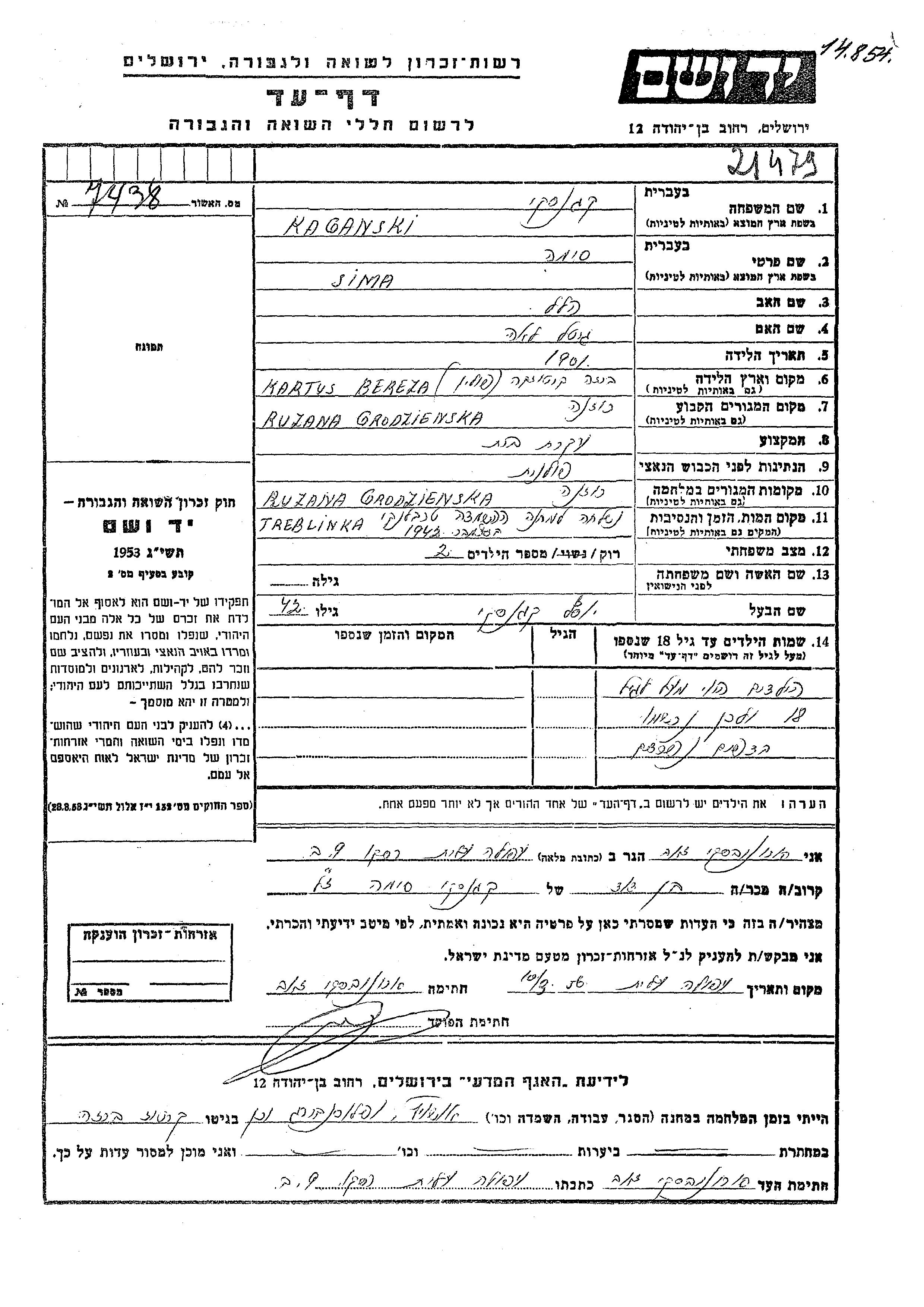 Сима Каганский, место рождения: Береза Картуская, Польша. Отец: Хилель, mать:Гитель Лея. Домохозяйка. Женат / замужем. Место жительства до войны: Ружаны, Польша. Место во время войны: Ружаны, Польша.