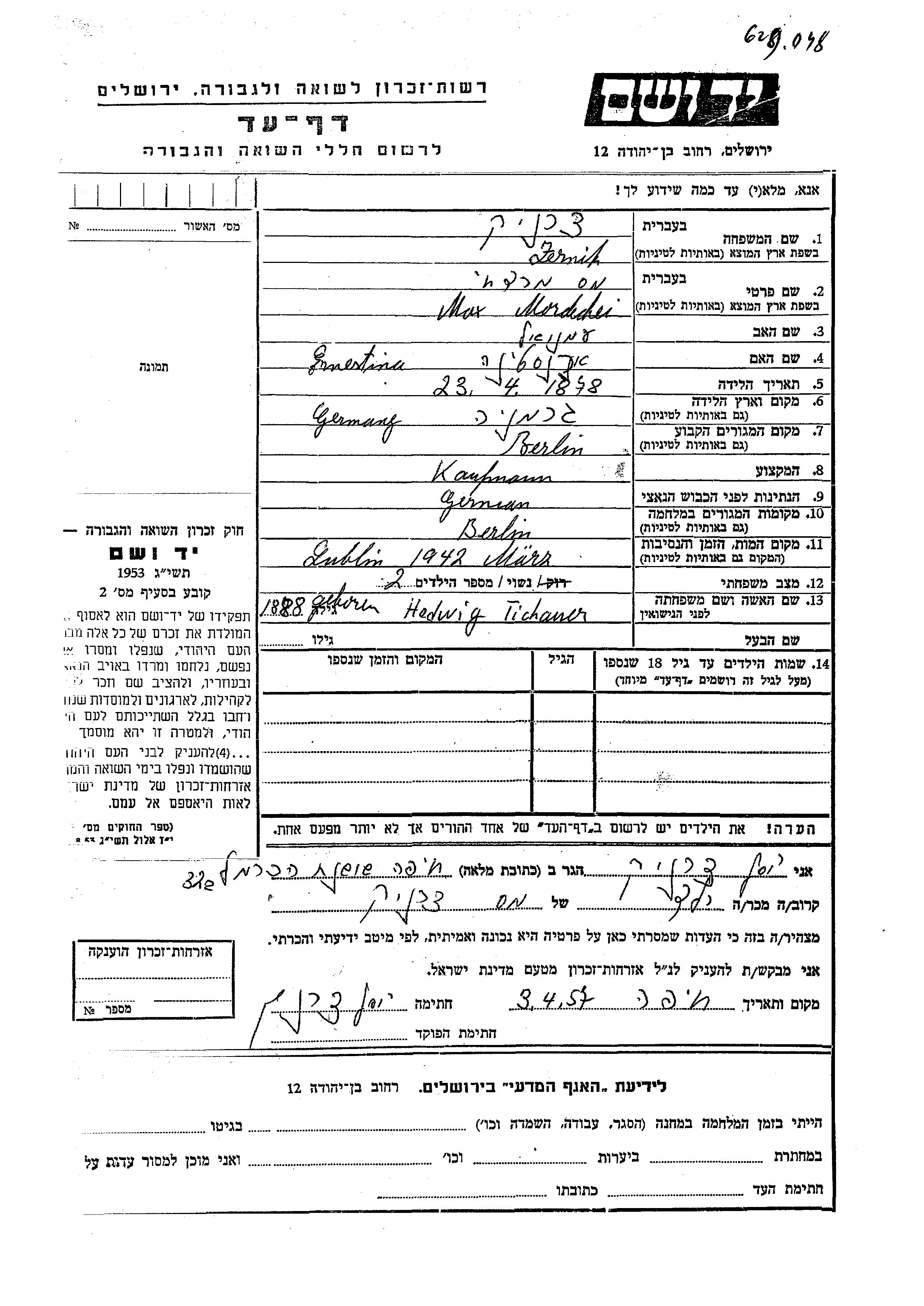 Мордехей Макс Церник, место рождения: Германия. Отец: Эмануэль, mать:Эрнестина. Торговец / торговка. Женат / замужем. Место жительства до войны: Берлин, Германия. Место во время войны: Берлин, Германия.